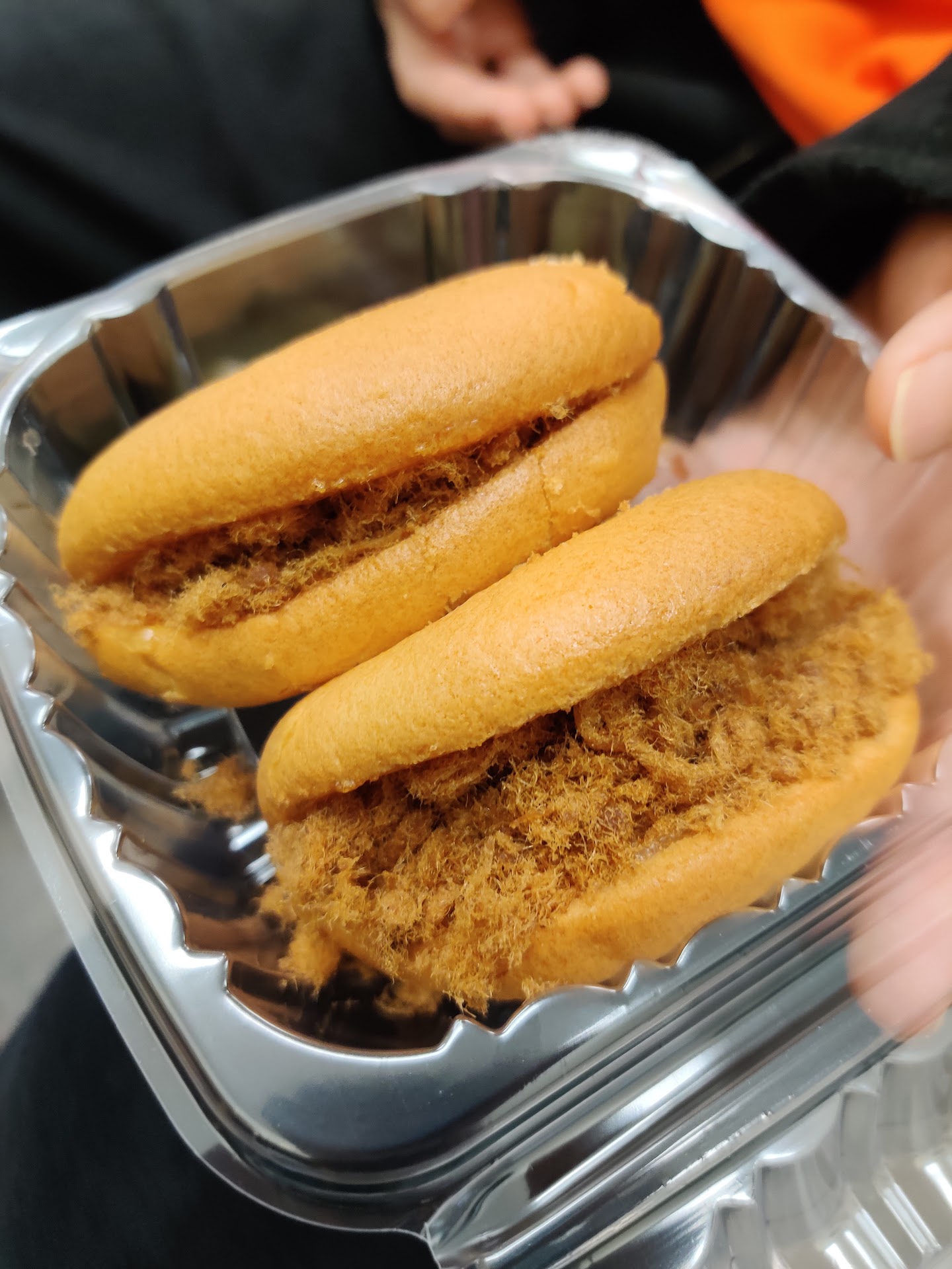 Pork pastry had pork floss, bread and a custard like sauce. Was...