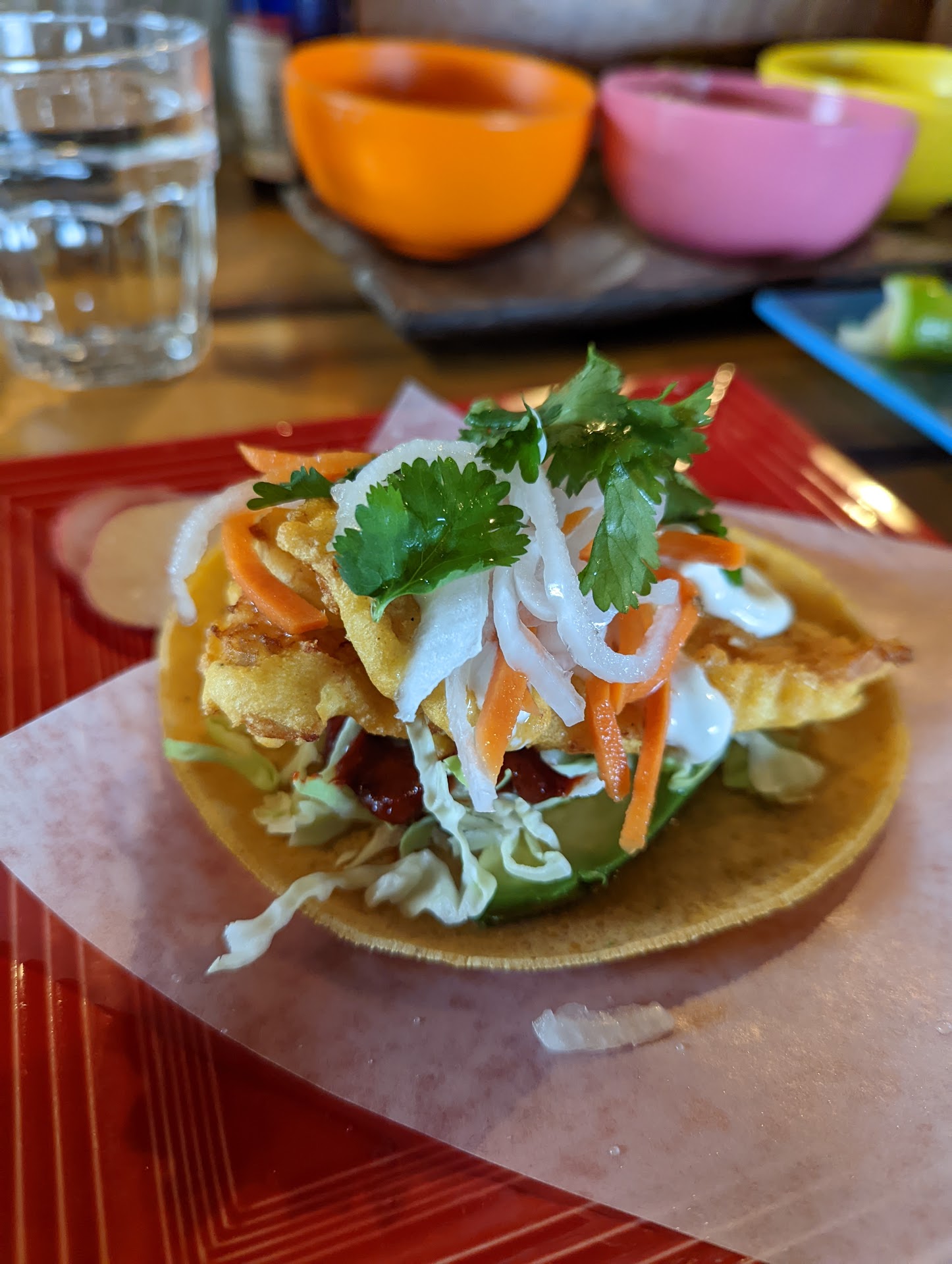 My wife took me for my birthday and I ordered the curry chicken taco, among other things. Halfway through my taco I felt a sharp puncture into the back of my mouth, almost at my throat. I pulled a very sharp chicken leg bone out, and my mouth bled as I went to the restroom. A staff came by and I told them that I almost swallowed a sharp chicken bone and would like to send it back. They asked me if I would like to finish my taco and I responded, no. They then asked me if I wanted another and again I said no. They took the plate and said, "that's never fun."