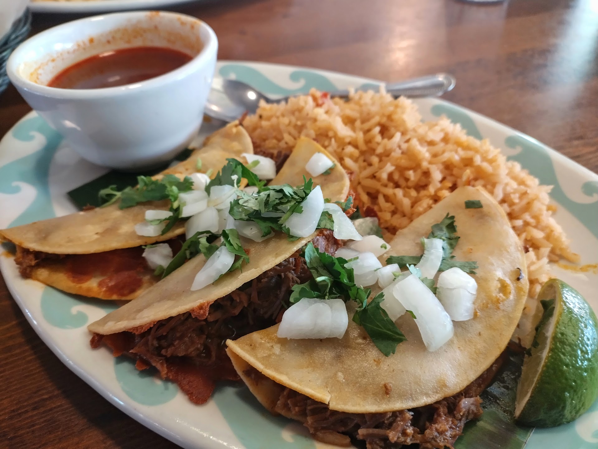 We looked over the menu, which is fairly robust...so many choices! A couple things caught my eye...they had a plate with grilled shrimp & carne asada, which looked enticing, for $27. I ended up ordering the $17.99 Birria Tacos- 3 medium-sized tacos, filled with tender beef, queso & cilantro & onions. A bowl of tasty Birria Consume was included, to dunk the tacos in. My meal was delicious, although I had to carefully avoid wearing all that dribbling juice.