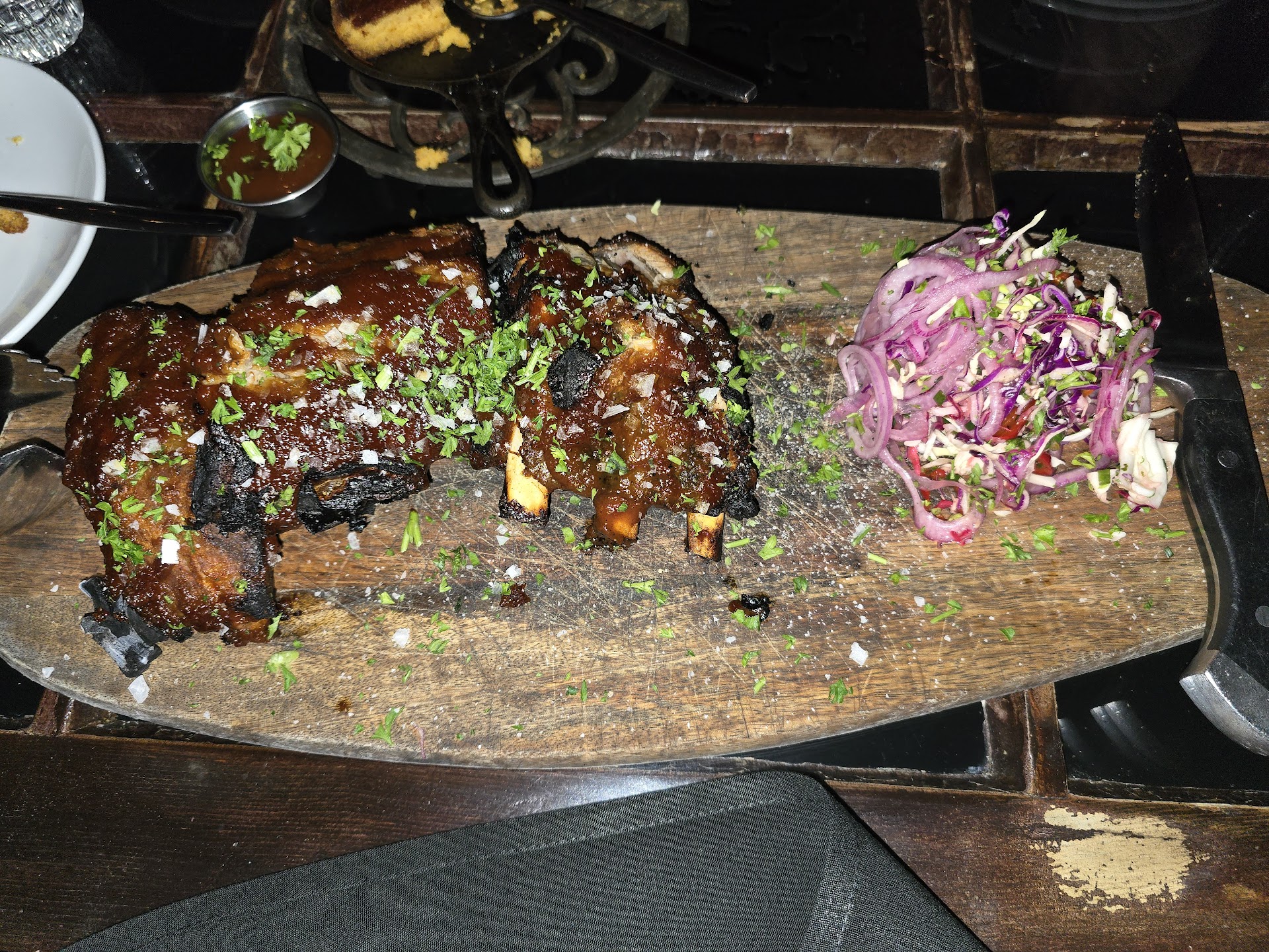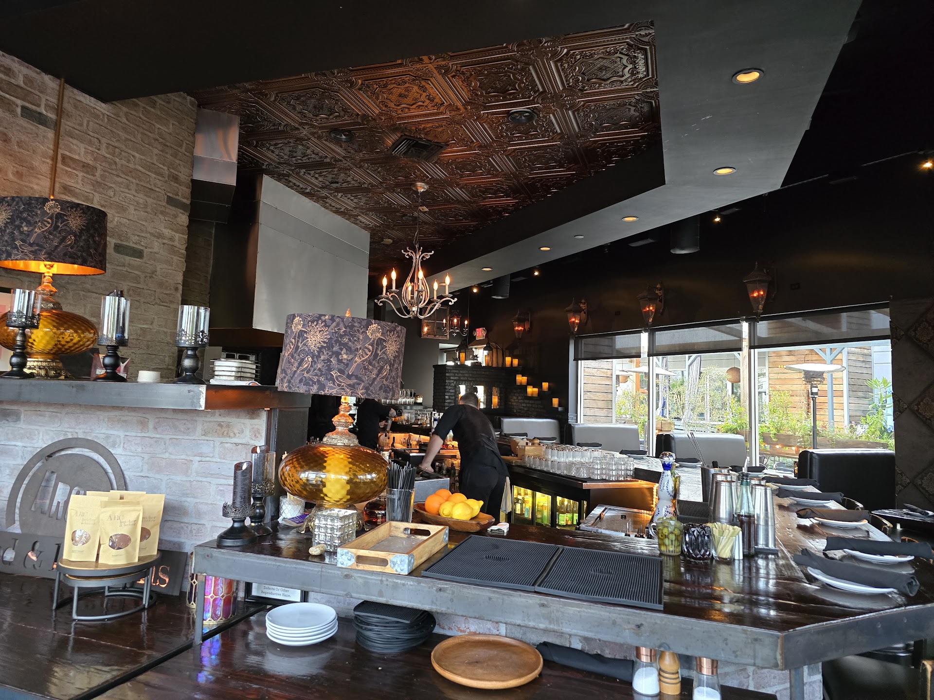 Read moreAfter driving by this place for years we decided to give it a try. We read the reviews and where expecting to be delighted. I'm no Foodie but I have been dining out for 20yrs or so. The atmosphere is great, moody dark light, very "hip". Warning though it's not really a restraunt for 2 people, the plates are all shared, and the price tag matches that. 75$ steak, for 3-5 people, as an example. That made it a bit tough to explore the menu for 2 people. We ordered bruscetta bread as an appetizer, that was the best part of the meal! Not knowing what to do we ordered the "fried chicken", which turned out to be nothing more than chicken strips served with mustard, ranch and ketchup based BBQ sauce. Seems like Raising canes does a much better job with these. The batter is sweet and the sauces, well it's sauce. 15$ for about 6 pieces served in a bowl. We also ordered the grilled cheese and tomato bisque. Nothing to write home about, and because all the other portions where meant for sharing and we both eat differently it was kinda a ditch effort. The soup was more like a dip very thick, not bad soup, but not fantastic. The grilled cheese was overly cheesed and very rich, made on a big ol' bun, filling but not the way you want, I couldn't eat much because as it got cold it got to be a ton of stiff cheese . The bar tender is not schooled in making drinks, we ordered a couple cocktails and where not that impressed, that finial touch seemed to be missing from those. All and all , nice staff, nice decor, average food as far as what we had. It makes you not sure if you want to bring 6 people here , what if the 75$ steak is...