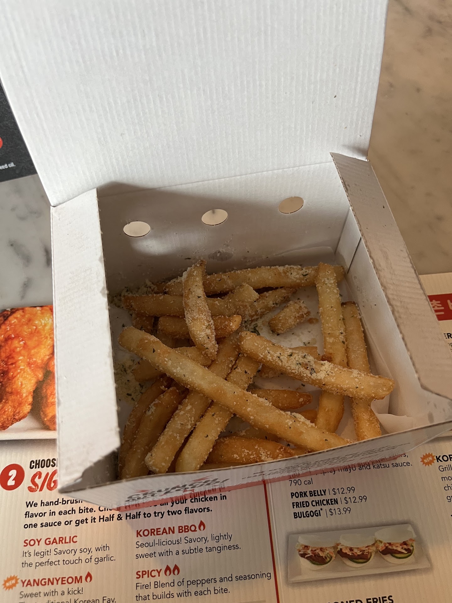 Read moreBecause I recently had a great experience at BONCHON Glenview, IL; I wanted my family to experience the same great experience that I had experienced at BONCHON Glenview, IL (Very flavorful chicken wings. Soy Garlic sauce type is not too salty, not too spicy, not too sweet. Spicy type was to me, quite stingy spicy such that I had to take a break after every 2 spicy wings. They do chicken wings right. ordered 30 pieces, crispy and juicy to the last piece! I had them for take out and they were still crispy until the next morning. ) Oh, what a bummer and worst experience of BONCHON at this branch. I had 30 wings for take out soy garlic flavor with extra radish pickles. It took me about same time back to family for them to try as I did back in Glenview, IL branch. First, wings were not a full size with flap parts like other branches did. I guess that may vary by the market location. Second, the wings were not crispy and juicy at all by the time serving my family. They were soggy and not equally marinated as well as some were under cooked. Third, the radish pickles were dry as hell and could not even taste the typical flavor of such Korean style radish pickles (and they charged $2 for them). Finally, the employees were not so friendly when they only had like 2 tables full out of like 10 tables (?) they have. I do not know what this branch is trying to do by cutting down on the quality of ingredients and flavors while over charging for the chicken wings (calculates to over $1 for each wing, and for 10 piece radish pickles). Shame on you for bringing the franchise reputation of BONCHON. I was very disappointed and will not ever go back to...