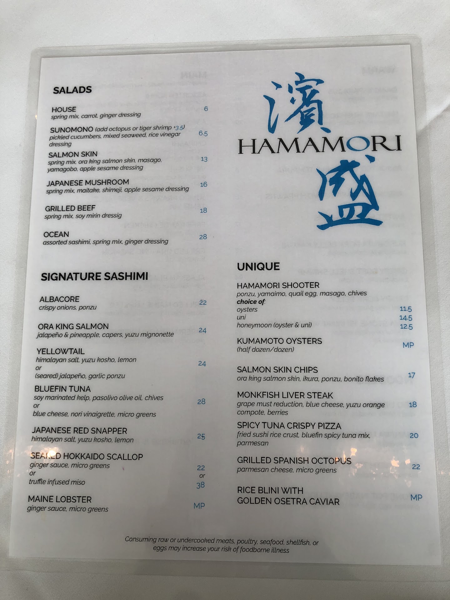 The food was great. I ordered the VIP sushi, and all of the sushi are very, very fresh. The hamamori shooter was interesting. The pork belly was amazing. It was my favorite, like, I literally closed my eyes to absorb the taste when I ate it because it was that good.