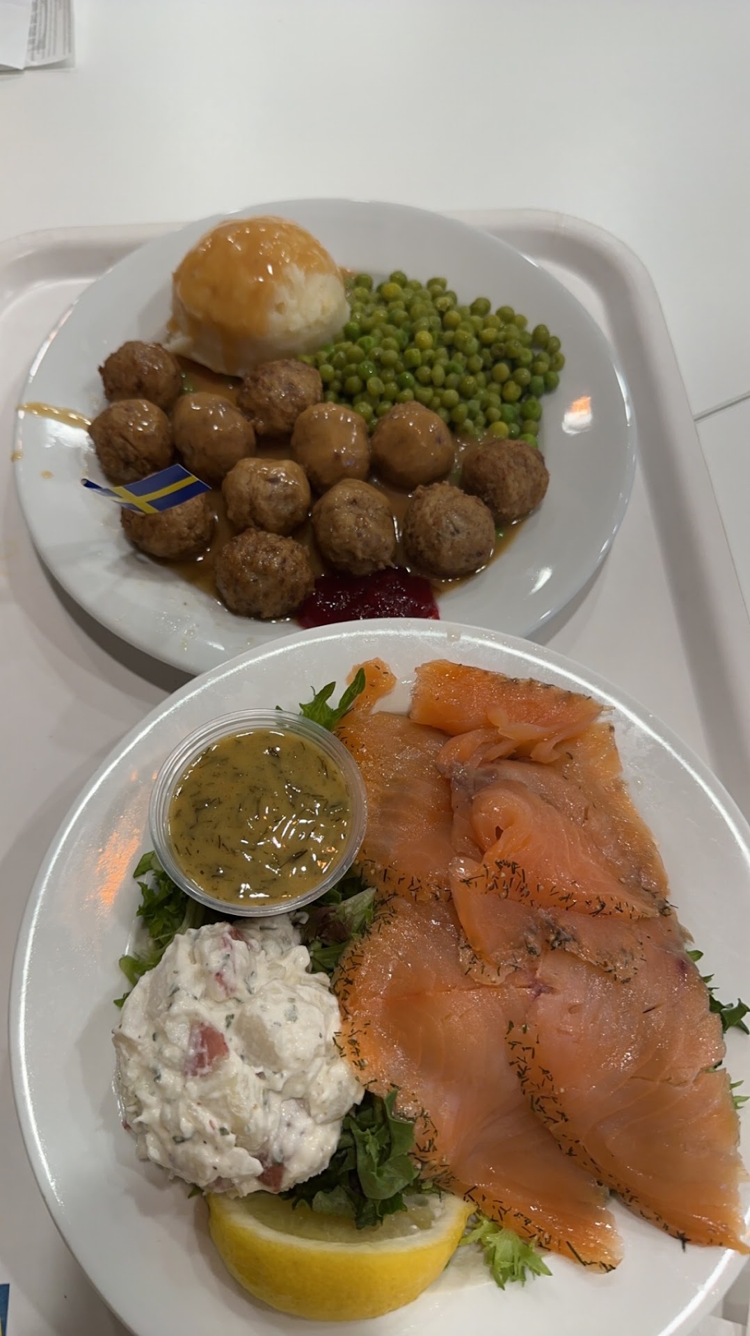 Ā Ā Ā Read moreEverything was really clean. Iād say the restaurant itself is kinda like a cafeteria style restaurant where you grab a tray and grab the desserts you like. Thereās a menu of entrees and as you move down you tell the workers over the counter which one you want. Pay at the cash register and drinks, utensils and clean up is something you have to do yourself. When youāre done with your food, dump the leftovers in the trash and place your tray on the shelf. Itās been about two years since Iāve had their meatballs and it is something I still enjoy eating; especially with their gravy and cranberry sauce. Their peas and mashed potatoes were quite bland so if you could sub it with another side, Iād try that. I also got their Stockholm salad which I LOVED. It came with smoked salmon, a mustardy-dill dressing that was quite strong and a little side of potato salad. As a fan of dill and mustard I didnāt mind how strong the flavor was but if you donāt like it, maybe go...