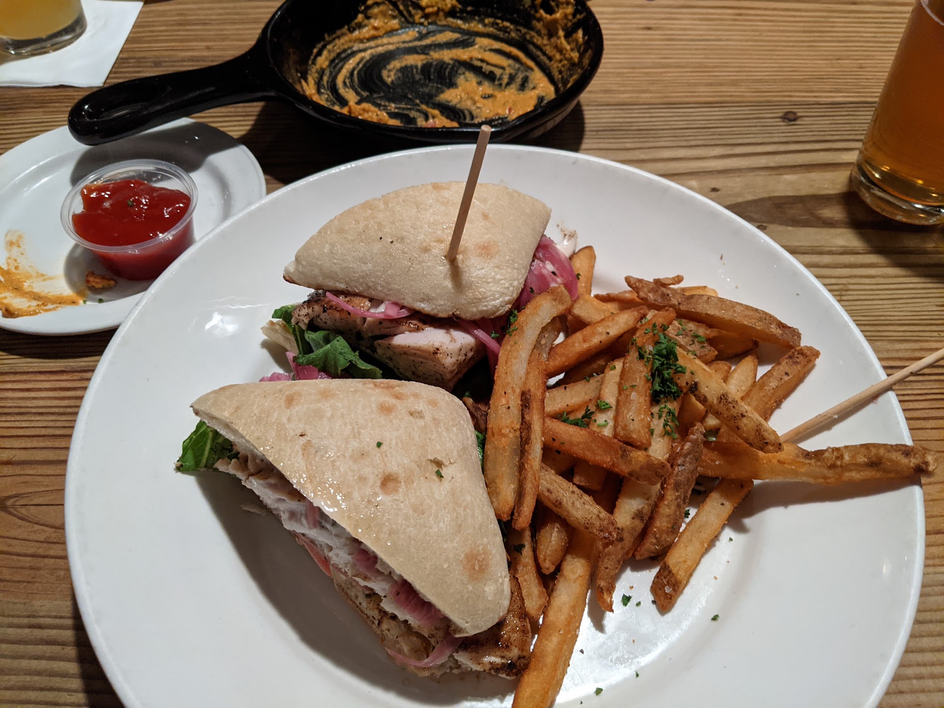 I split an order of the barbecue/crispy chicken salad and chicken sandwich and liked them both although I think I liked the salad a little more. It was really good. Bathrooms are posh and very clean. Also I love that there are plenty of booths inside. I love booth dining. I'll be back...