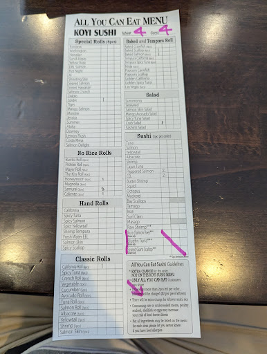 Read moreAYCE review: Keep in mind their only parameters are 3 round limit and premium nigiri ("raw" shrimp, ikura, bluefin tuna, scallop) is 2pp total.