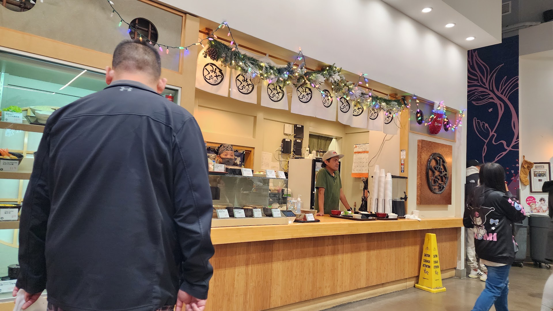 Also, you do not have to pay only in cash as in the past, ow they do take credit cards as well. One trick that we do is we will run inside the grocery area and get a little packet of sushi and bring that out to eat with our meal from Miyabi Yei or any of the other restaurants. So...