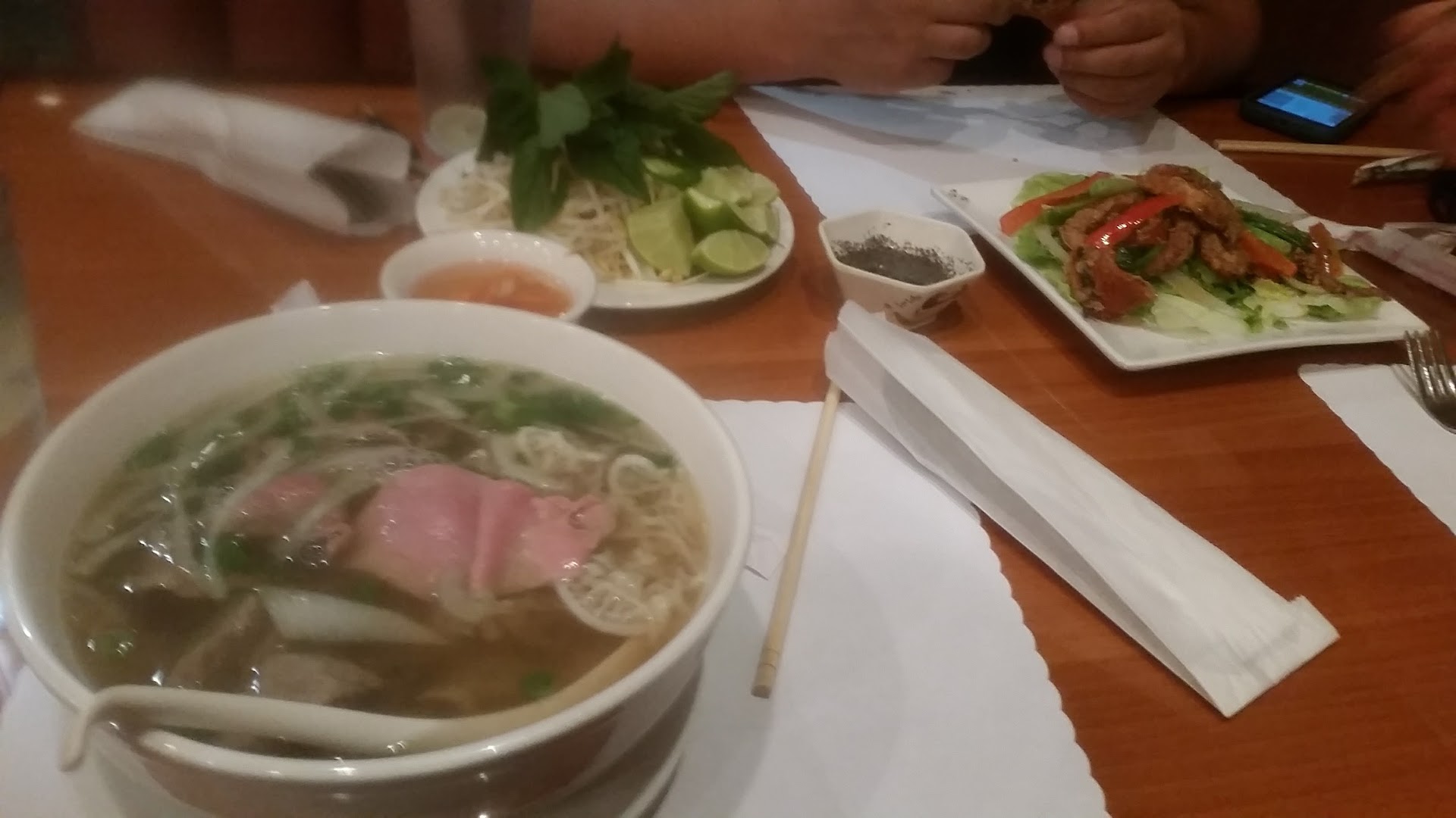 Maybe I'm just spoiled coming from Phoenix, but over there I could get a bigger bowl of pho, super large portions of beef (and many different kinds) not to mention a variety of herbs on my vegetable plate (and extra free vegetables if I asked!) for less than 5 bucks.
