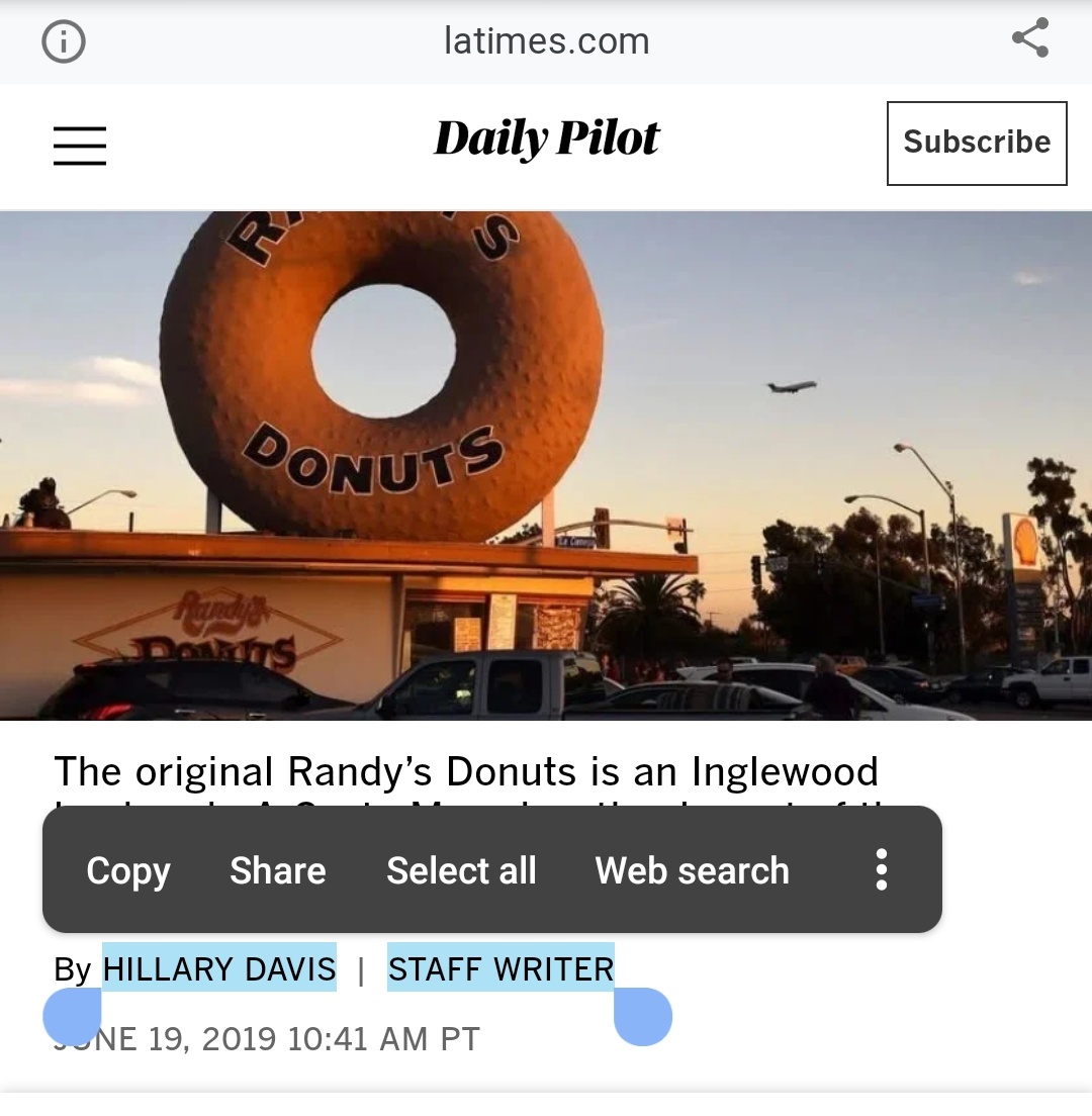 Read moreSo I've got I've got a test for donut shops I call it "the glazed donut, Maple bar test", and it's about 99.9% accurate! It's a two-pronged study of "the donut shop" (Randy's) and it starts out at first with the glazed donut... because the maple bar will throw my pallet off a little So they passed the glazed donut Maple bar test replaced donut was just better and Krispy Kreme by far and the maple bar it passed now I got to go back and hopefully those puppies are warm at like 5:00 a.m. or 4:30 a.m. I forgot to ask I always ask and I forgot to ask. As I was eating my donuts in the parking lot drinking a really good cup of coffee too, I'll have to give them "a" "a" and "a" in an "a' for the coffee, anyway sitting in my car and pulling up information about Randy's, and there's a awesome Community journalist who writes in the daily Pilot in the la.times and she's written a great article about the family who bought Randy's donuts how the dad found that Randy's donuts on the market, just really really good reporting, She Hillary Davis I really enjoyed that article and I'll put a link to it at the end of this review, and I'm afraid if we don't support online subscriptions to the newspapers that are left we're going to lose some of the best journalists or should I say only journalists. Anyway check them out they're...