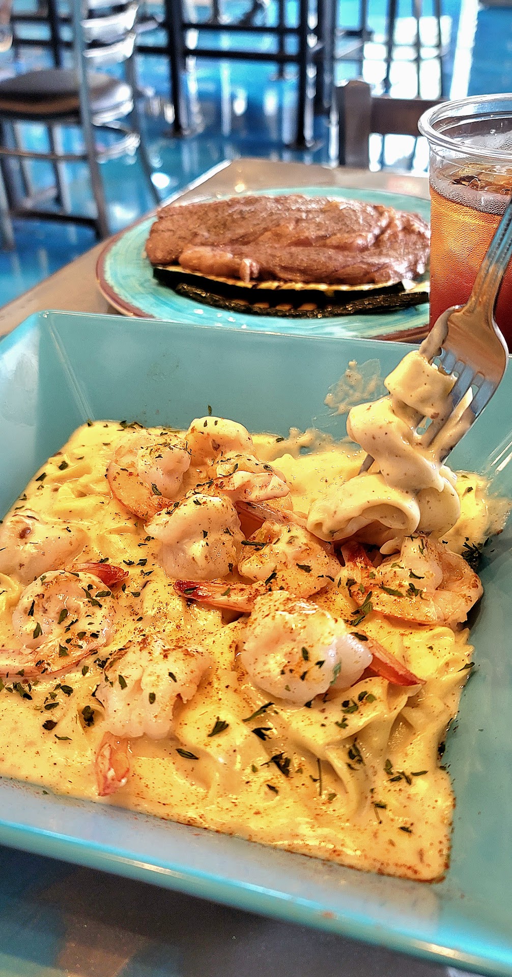 Read moreSimply Fish...is not just simply fish. The menu is extensive and has an array of offerings for most palettes! Surf & Turf, Shellfish, Meats, Signature Salads, Tacos, Sandwiches, Bowls, Keto. There's also a good selection of beers: Red Trolley Ale, Big Wave Golden Ale, Stella Artois, Estrella Jalisco, Space Dust IPA, Overcast Hazy IPA, Mission Brewing San Diego Blonde. Wine and Margaritas are also served along with a soda bar, tea, lemonade. The employees are all very helpful and friendly. The atmosphere is open, welcoming & fun. Music selection is spot on! Great mix of songs. Loud enough to enjoy the songs. Low enough so you can still enjoy table conversations. Now for the yummy stuff! Today is the Grand Opening! I had to start off with Medium Rare Ribeye with Asparagus and white rice. I also had the Fettuccine Alfredo with Shrimp. Both super delicious! The Ribeye was cooked to my liking. It was well seasoned. The Asparagus was not too soft or too hard and had a good grilled taste to it. The white rice was also cooked perfectly. They were great compliments to my Ribeye. Of course, there are other sides to choose from. Now for the Fettuccine Alfredo with Shrimp. It had the right amount of creamy Alfredo sauce. Anyone who knows me, knows I am all about the sauce and this Alfedo sauce made me smile and hum with content every time it hit my mouth. Creamy, cheesy, yummy. And the shrimp. Oh, my goodness, the shrimp! 10 plump butterflied shrimp! Grilled and full of flavor. All I can say is that both dishes made my taste buds dance & my tummy happy! I highly recommend coming out to enjoy a meal here. I know once you do, you will keep coming back! The best compliment is a recommendation to all you know. So...