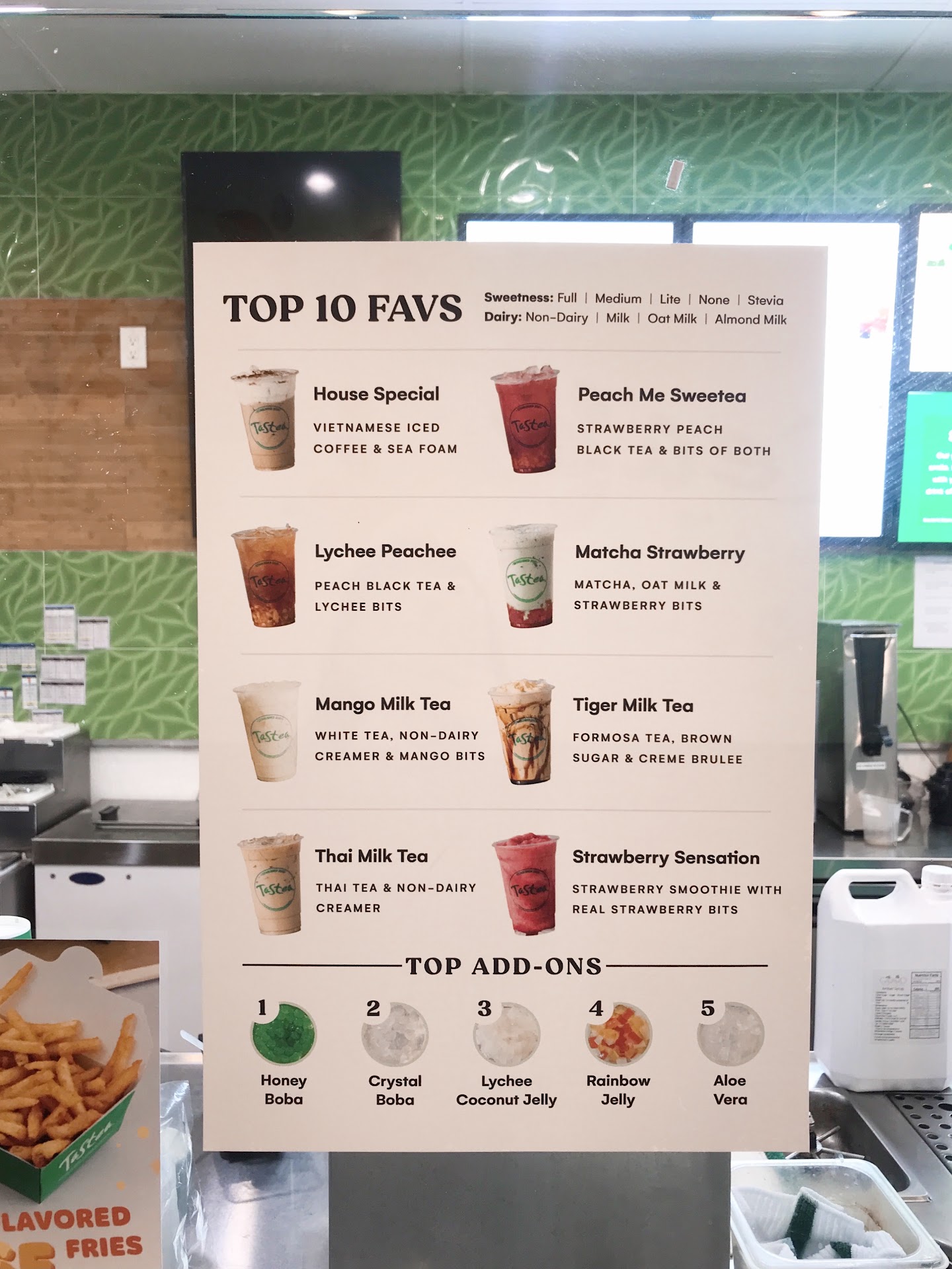 Tastea is one of our favorite boba franchises because their drinks are super fresh and flavorful. Their menu is the same as all their other places and we've never had any problems with our drinks. I highly recommend any of their Specialteas since they come with fresh fruit!