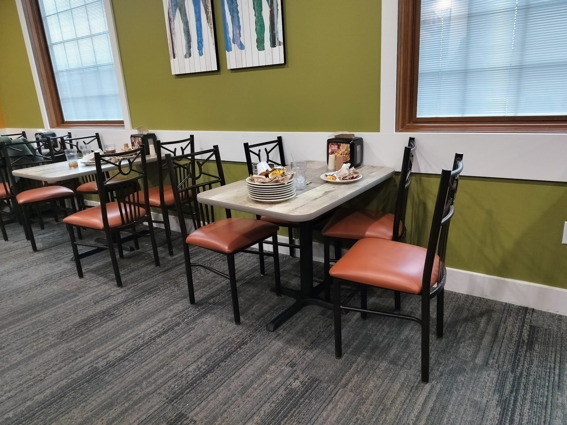 Every single table in that restaurant was filthy dirty. Dishes stacked on every single one. Totally unacceptable considering there were only 2 guests there and at least 6 employees who ignored us when we first got there. Employees walked by them several times and did nothing to remove them. It wasn't until more guests began to arrive that they began to clean the tables. Not once did anyone come and remove our plates while we were there.