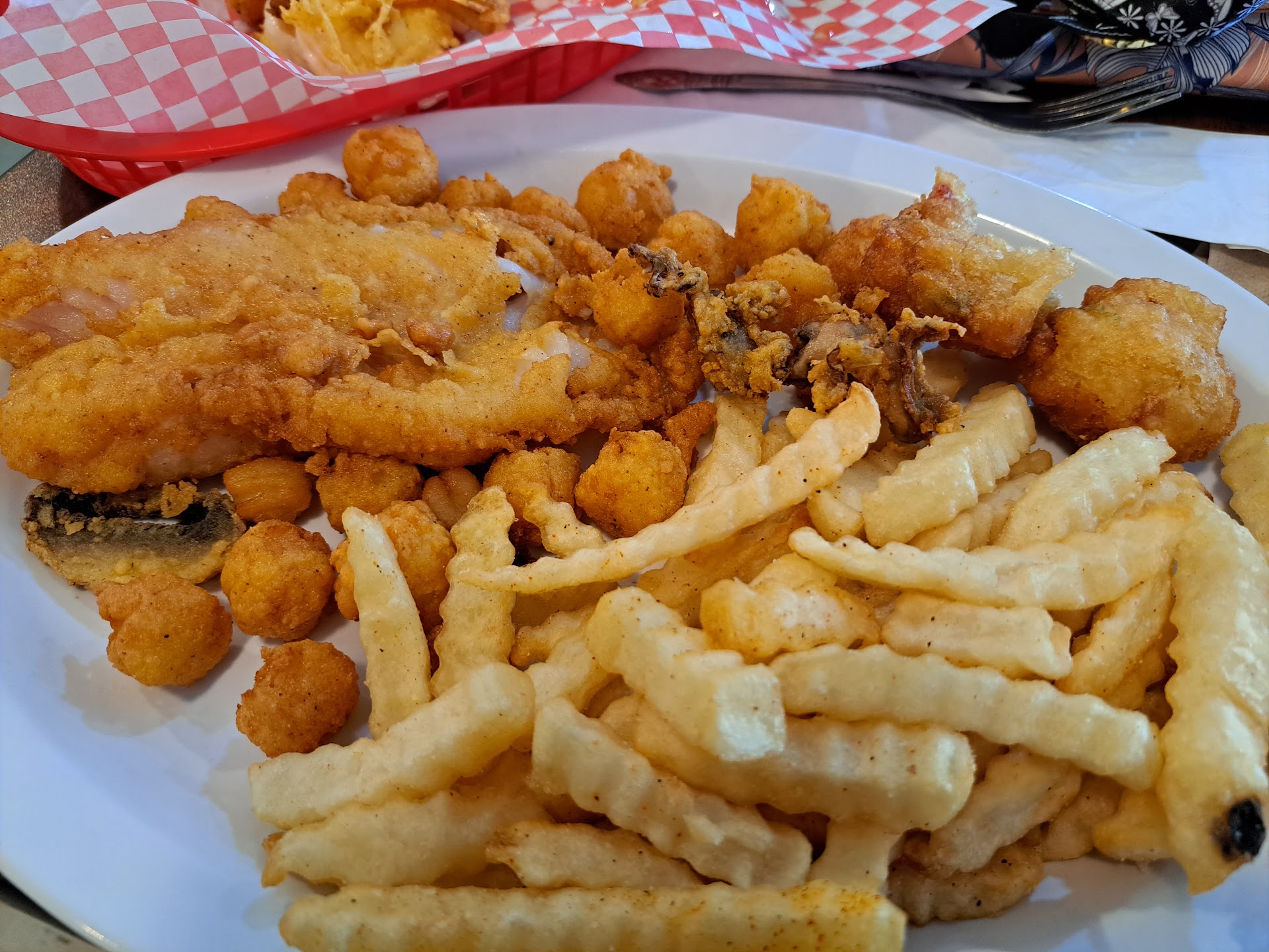 Read moreFriday night, 6pm. Food was awsome. Not too busy, but that is a good thing, only one waitress and one person in kitchen. However, it didn't take too long to get our food. I had real fried chicken strips with ff and my husband had the platter of fried grouper, oysters and huge fried shrimp along with hushpuppies, red beans and rice and ff. Everything was so good. The waitress was nice and seemed to be holding it all together inspite of having to take care of shucking oysters, drinks, bar customers, table service and cashier service. Would definitely come back here again. But if your one of those people who don't have any patience or understanding from when you get seated to getting menues and food orders, when there is only one waitress then this would not have been the...