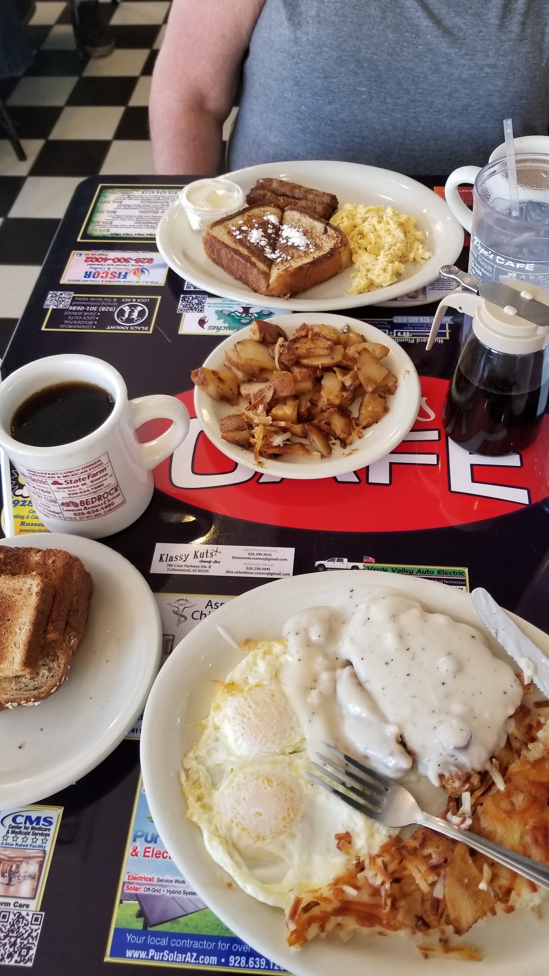 Read moreTo be welcomed and warmly greeted at the door by the owner, having a seat (for 2) ready upon arrival, promptly serviced and order taken, all without a reservation or anyone knowing you've decided to even stop for food was pretty spectacular! Then to have a multitude of breakfast selections to choose from while sipping fresh, hot, and tasty coffee in a warm setting (even while clearly a very busy and popular place) was very comforting. With 2 breakfast orders placed, one variant from the menu and a daily special of chicken fried steak, we were consistently checked on for more coffee and water during the minimal wait. Exceptional hashbrowns and home fries (we ordered both), perfect eggs, excellently prepared fried steak and melt in your mouth french toast hit the spot! Pepe's was a top to bottom clean environment, "fresh-smelling" clean restroom, and well maintained throughout. No one was rushed for their table, as there were a couple different older groups having coffee before their outing that were seated before we arrived and as we were leaving. Open from 7am - 3pm I highly recommend finding time in your day to stop by and have a bite to really feel at home away from home to see how it should be done. If anything negative could be said, it was how hard it was trying to find a parking spot, but now I understand why it was worth seeking out. Best kept "local treasure" in Arizona, without question! Our new favorite AZ must stop...