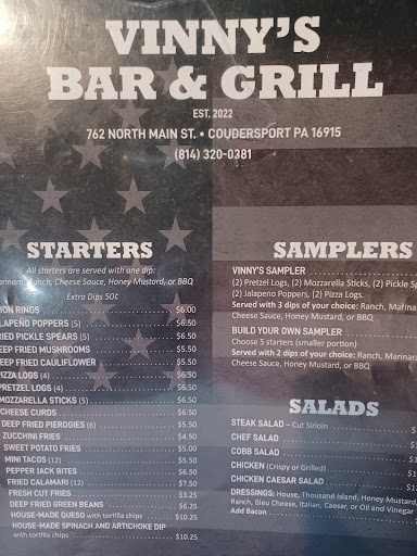 We asked to eat on their patio today as we had our dog with us. They were very accommodating and even put up an umbrella for us. The young woman who served us was visibly overworked as she was serving the entire restaurant and bar by herself. Even with that she was very sweet and brought our food to us in a timely manner. We had the pretzel sticks with cheese, I had a grilled chicken sandwich and my husband had the breakfast burger. Our food was hot and tasted very good. Our complaints and our disappointment lies with the fact that the business seems to be going through a name change or possibly a change of ownership. Not sure if the proper name is Vinney's or Mosch's Tavern. The bathroom walls had putty all over the place. The stalls had no toilet paper holders and the deck needs attention. Also, the restaurant is smoke free but for some reason the deck where people eat is being used as a smoking lounge. Upon arriving at the back parking lot we literally witnessed two women finish their cigarettes and throw them off the deck into the parking lot. That is not only disgusting but dangerous. Because of this the entire patio area smells like an ashtray. If we are in the area again we would not eat outside, inside maybe but definitely not on the patio. I think the owners have some things to consider moving forward and I hope they do. Overall we had a...