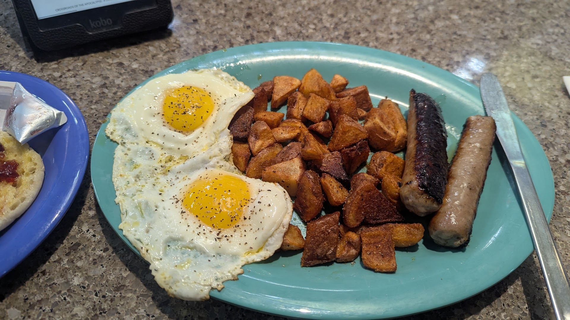 I didn't get a picture, but patrons near me ordered chicken fried steaks. The steaks almost covered the plate and were covered in country gravy. Their eggs and potatoes came on a separate plate. Unless you've got a huge appetite, I doubt that you'd manage to finish that meal. Definitely worth the price, which they had originally questioned as being out of line with some of the other breakfast options on the menu.