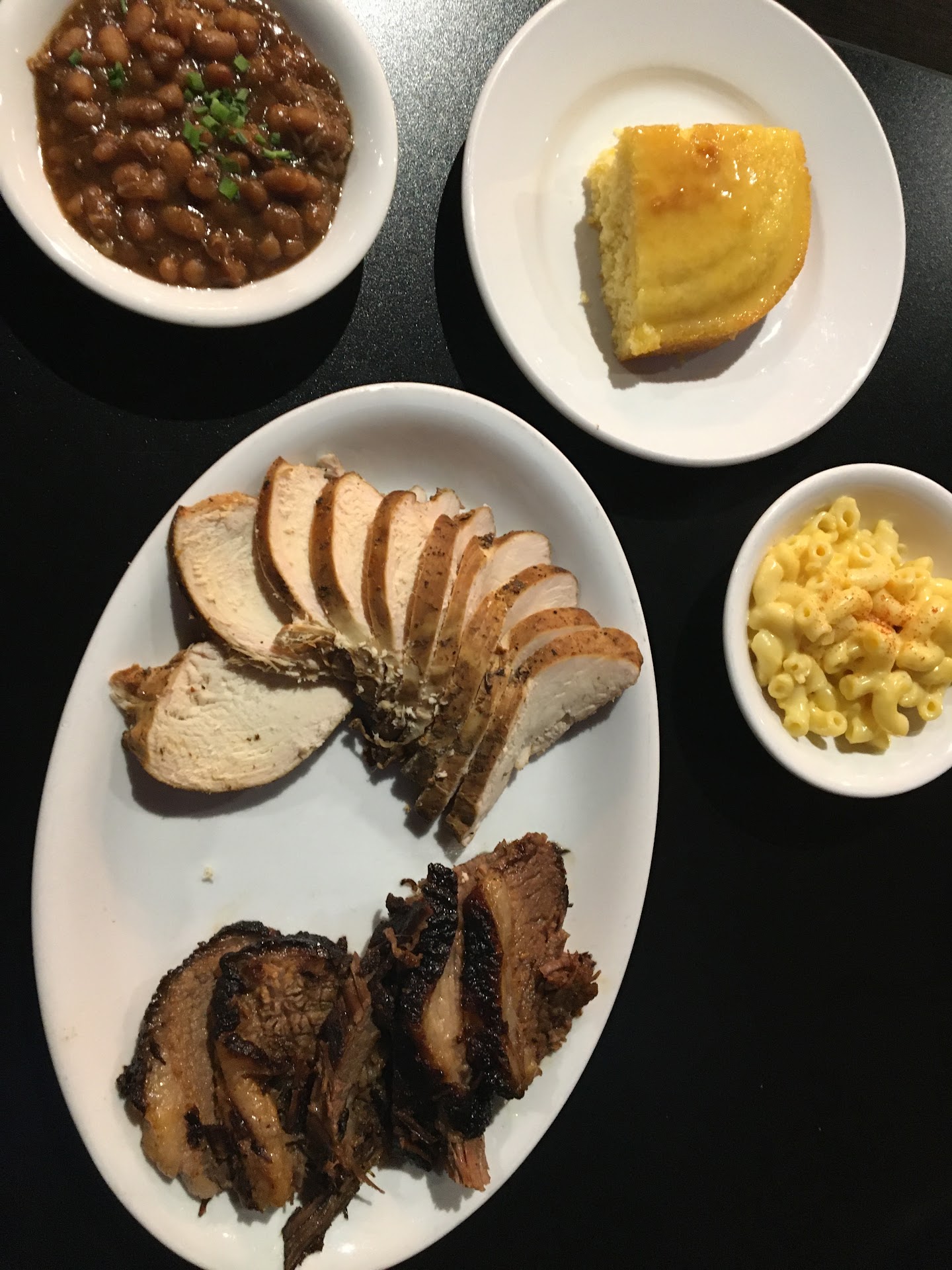 We then ordered the same meal, the special, pulled pork sandwich with sides of Mac and cheese and corn bread. The did arrived quickly. Bun was stale. Meat was dry and had no taste of smoke. The canned peppers and onions on top of the meat were not to my liking. The portion was small as well. We tried all the BBQ sauces and they were the better part of the meal but nothing to write home about.