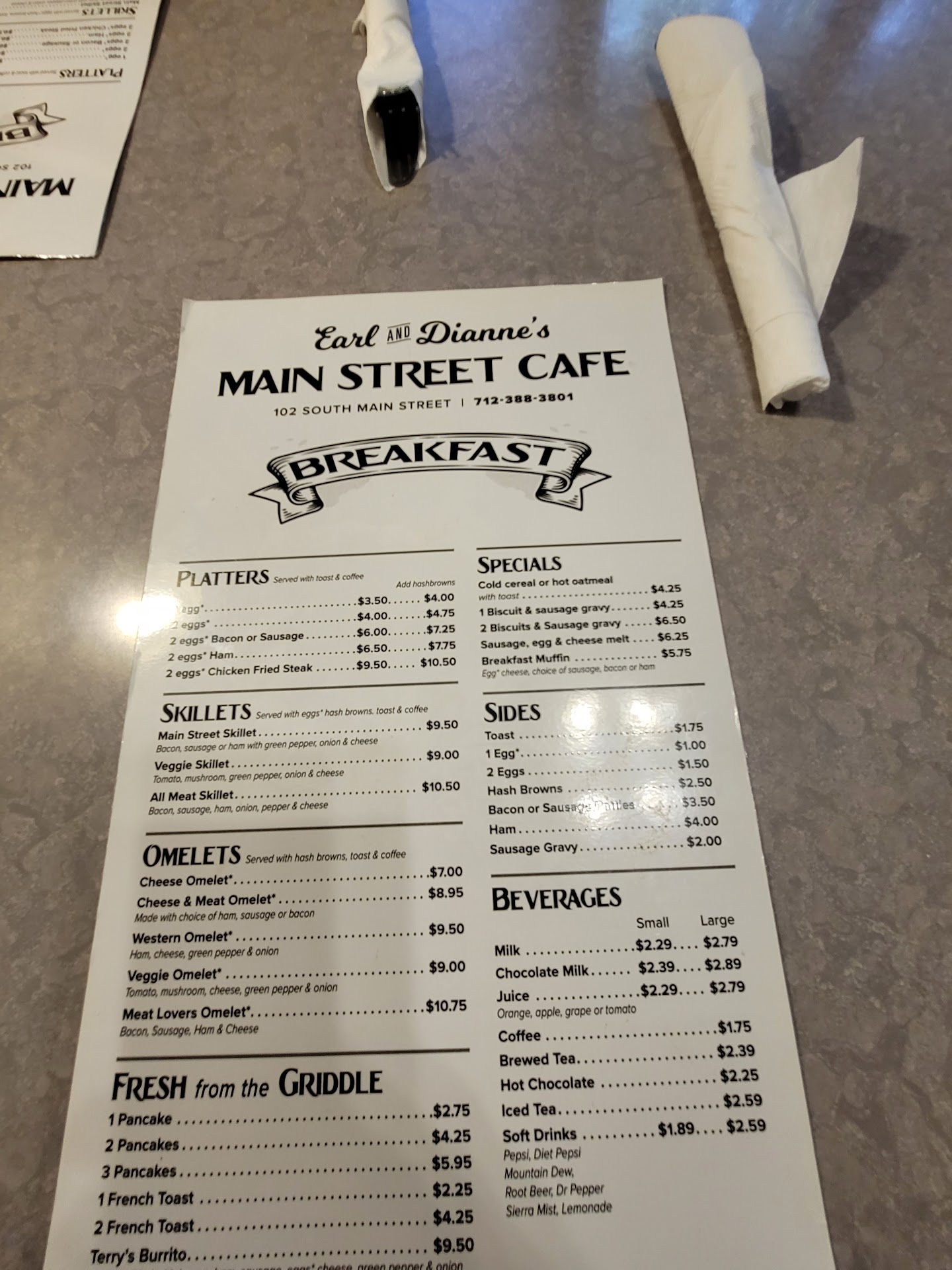 I went here looking for a Mom, and Pop diner experience. Let me tell you how I appreciated it. The service was wonderful for a small town Cafe, and the breakfast was wonderful, I first ordered 2 eggs hashbowns, and toast with a large orange juice. I ended up adding an egg, and buying a big piece of apple pie to go, I added a five dollar tip, and the people were friendly, the whole experience ended up costing me a remarkable price of fourteen dollars and some change, including the tip. I appreciated the good old fashion hospitality of this wonderfully quaint Mainstreet Cafe. Thank you, and I will be back and tell everyone I can. Just moved here, and that was such a great experience, again, thank you. ...