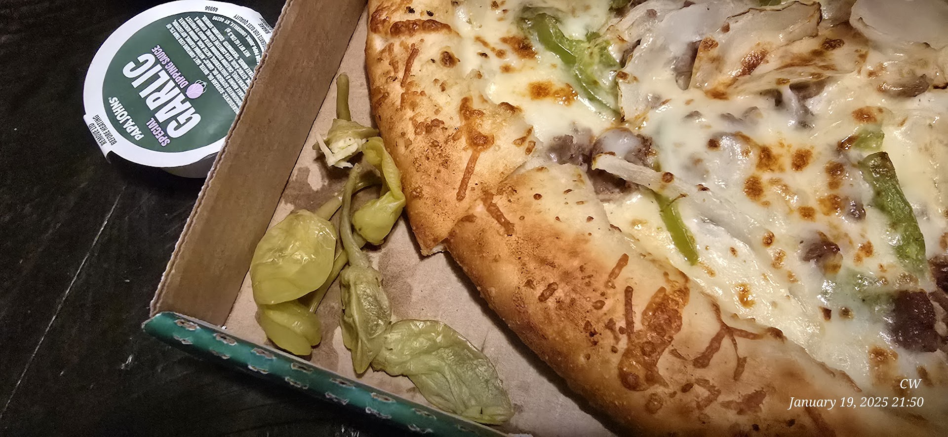 And this really is my fault because we were going to get pizza from either Bertha's or Pizza King but I figured it would be faster just to pick it up from Papa John's.