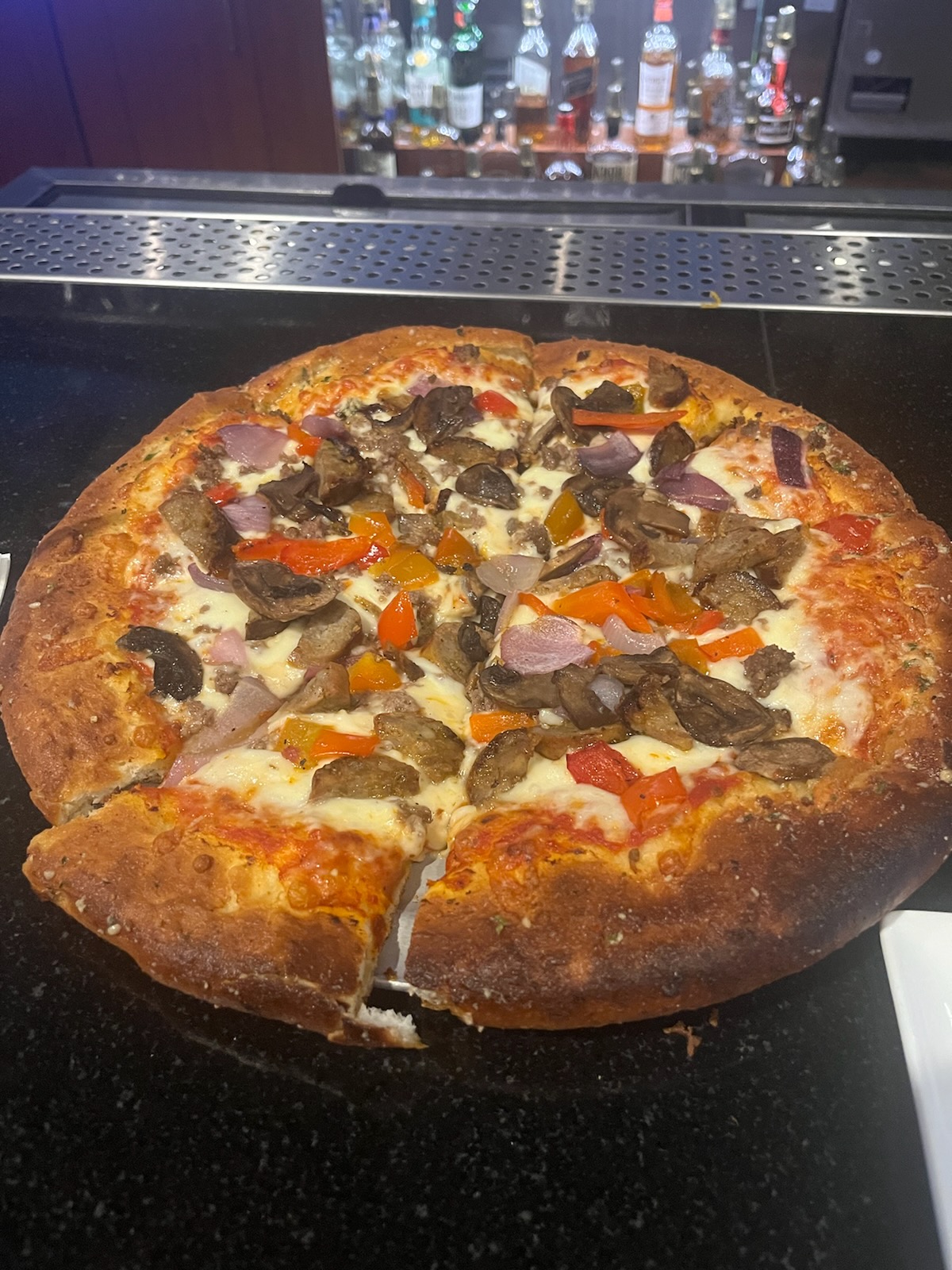 Great sports bar! Good place for someone traveling alone or a group of friends. No shortage of seating with a perfect view of multiple screens from every seat. Watch the brick oven pizzas being made while keeping up with your team. The pizza isn't a thick or thin crust, in the middle, with a nice crunch. Homemade chili, not too salty & no noodles! Plus, it comes with the sour cream, cheese, & onions, no charge. We didn't get a picture of the delicious wings before they were all gone!Friendly staff each time we've been here. They are just the right mix of attentive but not annoying. We will continue to stop in when we stay at the Ameristar in Omaha. Highly recommend.