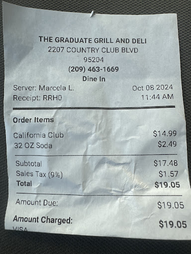 Read moreThis restaurant retains the name so they’re gonna have a big job living up to that name. I’m not sure they did that when we were there. I don’t drink but a lot of people are complaining that they DO NOT SELL ALCOHOL. That was a big reason that people used to hang out at the Graduate… drink beer and watch the game! Half of Stockton grew up at the Graduate. Hopefully they will live up to their legacy. A lot of the items on their menu are reminiscent of the old Graduates menu i.e. Gradburgers. BUT… if they are going to use the name graduate, they really have to try and live up to that name. So far they’re struggling to that end. The pizza dough is not good at all. No pork… no pork bacon, no pork sausage on the pizzas. No beer or alcohol. I don’t know… They really have to figure it out. I hope they read the reviews and make some tweaks so they can succeed Next time we go that’s what I will probably order.