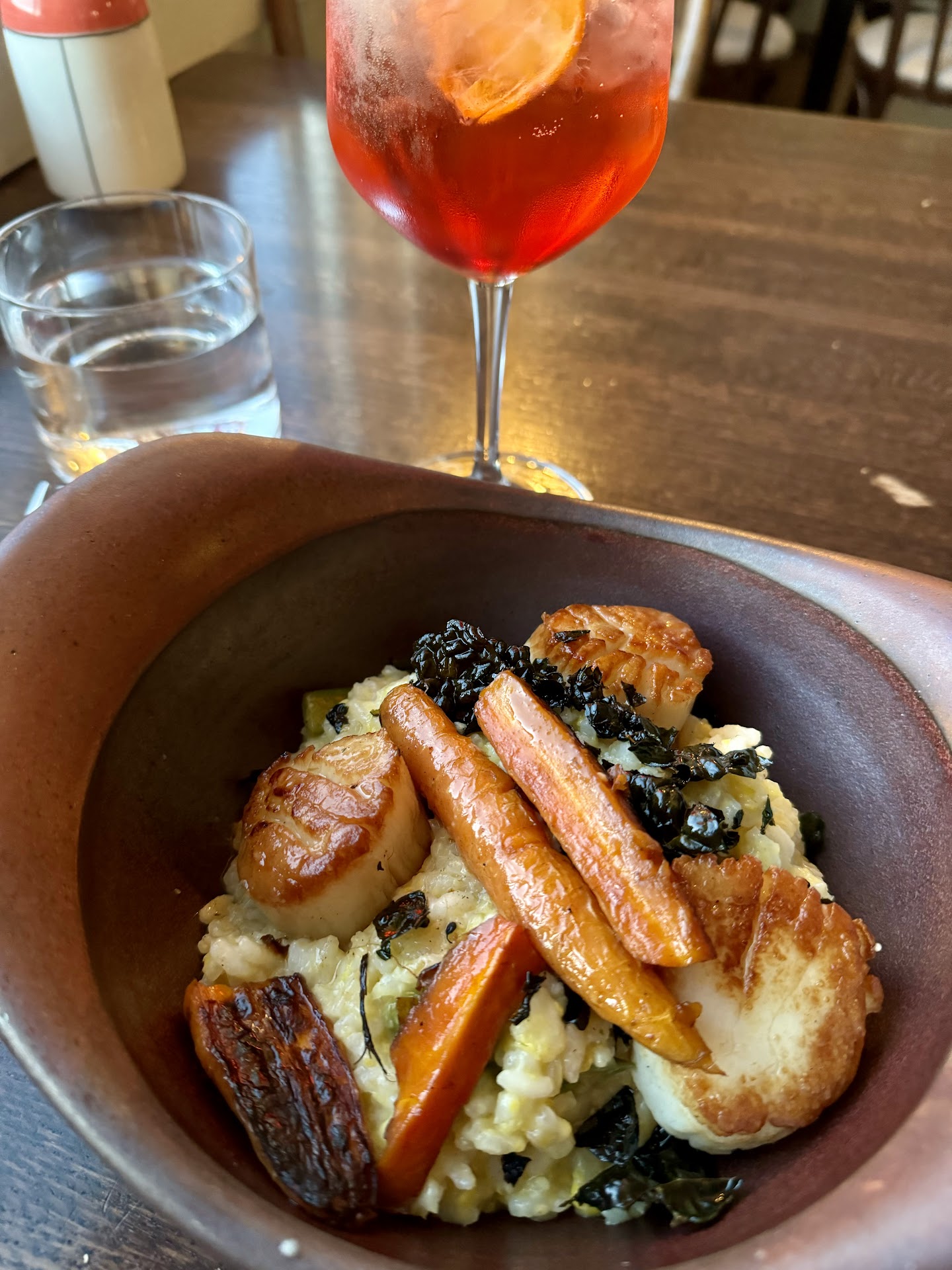 We first dine here 3 years ago and was extremely impressed with the drinks and beautiful dishes here, so we decided to drive 3hours/cross the ferry to come back for another try. I noticed there has been a shift with the menu. The chef’s definitely looking for innovative way and put twists on classic dishes. Some dishes are delicious, but some make me wonder a little bit. The oyster was super fresh and delicious, but both the oysters and mignonette were at room temperature, combined with the evening toasty temperature in the ceiling fan-operated dining room full of guests makes the taste of the oyster less refreshing. While I appreciate the nature-like look of rocks underneath the oysters, I wish it was ice instead (the usual way) and shaved ice in the mignonette to chill things out. The strawberry and rhubarb butter was very creative and has such a pretty pink color! Unfortunately, the taste of the sweet butter on top of the naturally sweet bread takes out the savory salt butter feel that I love in bread-and-butter combo. It feels less satisfying, like something is missing… The ceviche trio has really fresh crab and shrimp in it. I did not like the cauliflower/tomato with big chunks of pickled cucumber component in the trio at all. Also there’s some issue with the plating. The 3 components were put in 3 little ramekins with tiny spoons on a crowded plate did not make sense to me. You want to be able to scoop off the protein with the chips and enjoy the bite easily, rather than having to maneuver around this tiny spoon and tiny ramekin. I felt like it took me way more work and way longer to eat this dish which makes it less enjoyable. I did make a joke and gave the feedback with one of the chefs, and he said “we have bigger spoons back there” which was hilarious. The scallop risotto was the highlight of the night! Scallop was cooked perfectly, so was the risotto. The snap peas in carrots with the crunchy element, complemented it very well. I wish there was more snap peas in it. Definitely worth the money. The freshly made gnocchi was nice and fluffy, good flavors as expected. The chai crème brûlée was the strangest dessert I’ve ever had. It tastes like very sweet gingerbread as you bite into it and then has a sweet cream aftertaste. Tbh the texture is not what you would expect from a crème brûlée, but A+ to the chef for thinking outside of the box. I ordered three different cocktails and wasn’t too impressed with any of them, which was a bummer.. because I remember how the cocktail used to be super pretty looking and delicious. Overall, it was a fun dining experience. The one dish I would come back for is the...