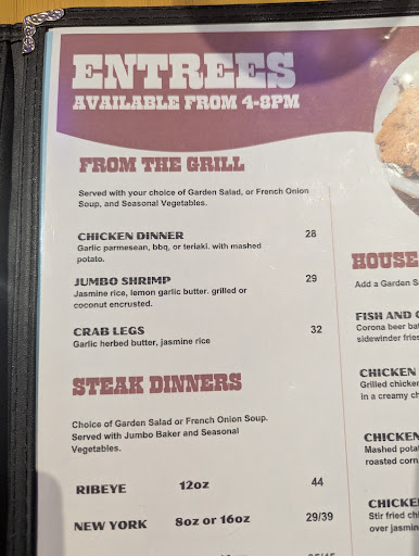 Read moreWe want to support our local restaurants, and went here last night for dinner. The experience started before we even got to the door. I'm disabled, in a wheelchair, and to get in the door, have to position the wheelchair within inches of the steps. No way should this be considered wheelchair accessible. We sat down and ordered, a ribeye with a side skewer of shrimp, and a bacon wrapped tenderloin. The salad came, and we had to ask for silverware. Then we had to request salt and pepper. The salad itself was very nice. Our meals arrived, missing the shrimp skewer. My tenderloin, ordered medium rare, was a perfect well-done. The ribeye, ordered medium was closer to rare. They did offer to replace the steak steaks, but I refused the offer, the experience at that point just put a damper on the evening) Spoke with the manager before leaving, and I really hope they train the staff better. All in all, a big disappointment. We will return in a month or two, give them another chance, and update...