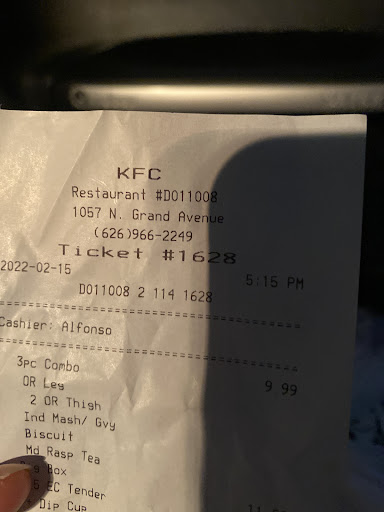 Read moreI was in the drive thru and told the chicken would take 15 mins, but before that I was told several different versions, they didn’t have extra crispy, then they did then they had a wing and a breast, I said I’ll take that, then it was they don’t have it. Then another customer ordered extra crispy too. But they weren’t waiting for their order. Finally several orders are done but not mine. Those orders were after mine. I was told those other orders were extra crispy Breast and wing.. mmmmm, I said, I would take that but was told you were out. Then I eat my food and it’s extremely salty to the point where I can’t eat it. I ordered a 3 piece I ate 1 piece I got a headache so bad from the salt I suffer from migraines. Was my food deliberately over salted, I’m not sure but it appears it was. Covina KFC not my favorite...