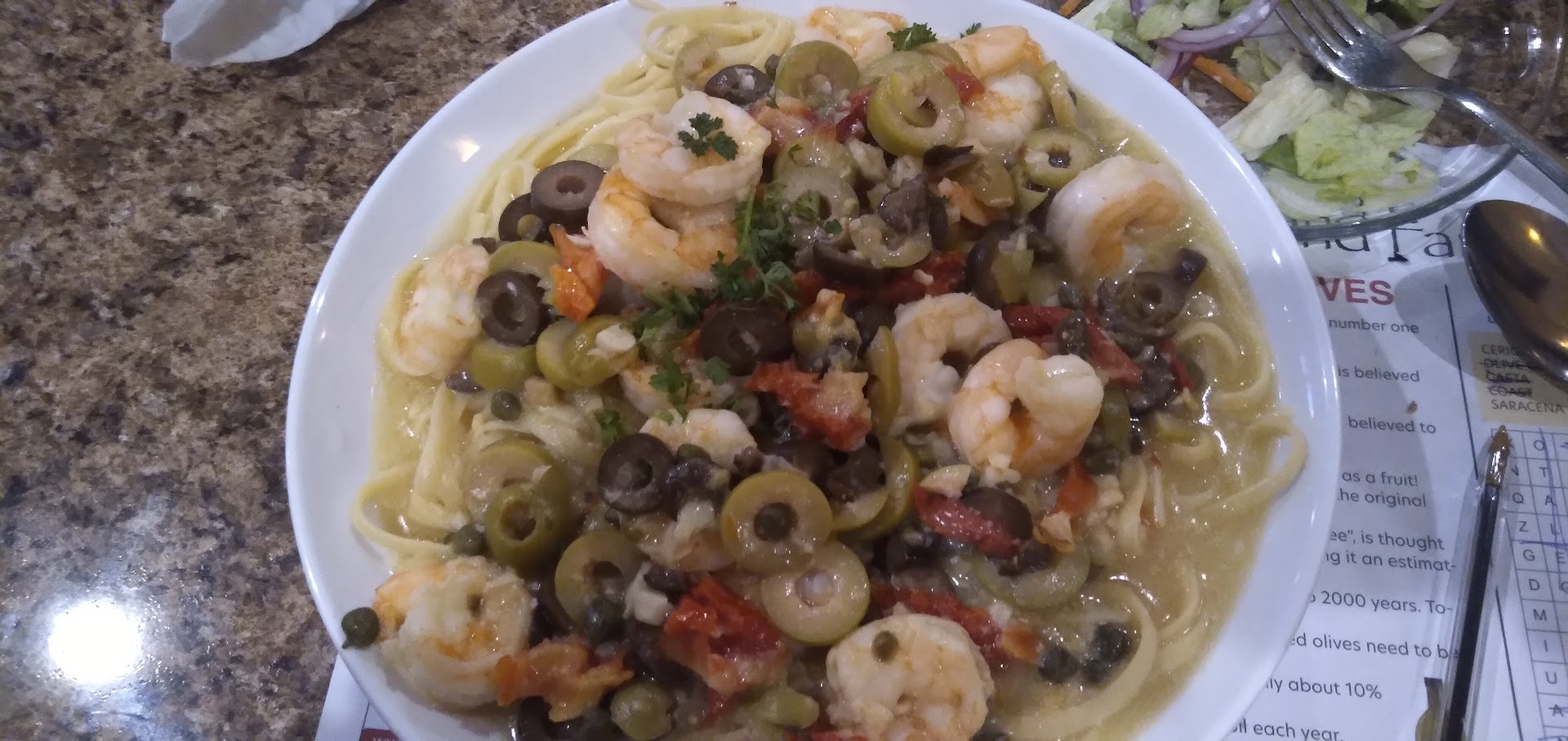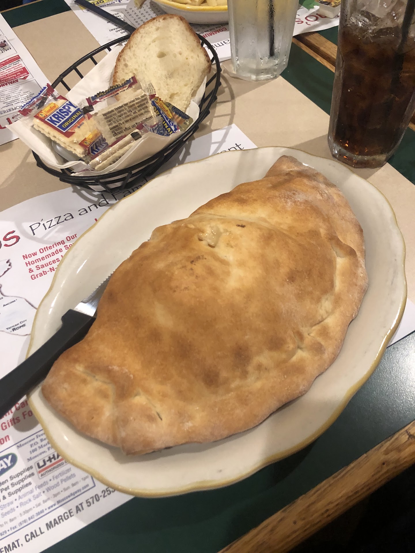 I was warned about ordering a meal in a place known for being a pizza joint. I ordered the Mediterranean Seafood over linguine. Which I was totally not happy with. I do love Capers and sun-dried tomatoes,but, the amount of green and black olives was overwhelming. And I'm sure it was the green olives that contributed to the unbearable saltiness of the dish. The shrimp were okay but the overall flavor was not to my liking at all. I usually like white wine and butter sauce. Maybe there's someone out there that likes this dish but, I would have suggested removing it from the menu entirely. My other half ordered fish and chips and we might be spoiled because of" the whip" down around Kennett Square and the Irish Pub up in Jim Thorpe.... but these were some of the worst fish and chips we ever had. The fish pieces definitely look like they were bought from Price Right in a bag and just thrown on a plate and now it became a meal for the restaurant. The fries are definitely the Frozen bag kind that they stock supply to restaurants.Ok but nothing to write home about. The salads were okay also nothing fabulous, and the wings were average wings, bone in type. Also be aware that when they ask you about sauces they are charging you for them. Like do you want red sauce or tartar sauce. They will show up on your bill. They get points for the wine and beer fill. The beer was properly chilled and my Cabernet actually wasn't bad at all they had a mid-range brand. In the picture there's a little less beer in the glass. He couldn't wait. P.S. bathrooms were clean and spacious, picture included. We were back in the lounge area and our waitress was over the top.10 out of 10 for accuracy, promptness ...