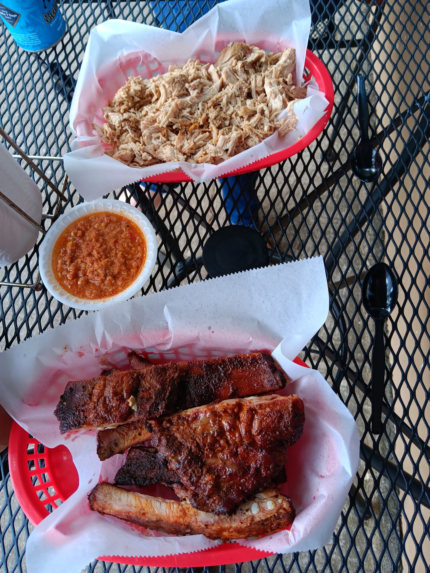 Ribs - These are tender and smokey. The ribs have an excellent smokey taste and perfect chew. They are served dry and you can sauce them as you please. Pulled Pork - The plate which is served with 2 sides and Texas toast is delicious. The meat is well seasoned and tender. It always has a good balance of interior meat and bark. There are numerous sides to choose from. My favorites are Brunswick stew and baked beans. Que Taters - A pile of fries topped with a generous portion of pulled pork, BBQ sauce, cheese and sour cream. These are amazing. This will make a full meal! Big Tex Sandwich - A pile of tender pulled pork served between 2 slices of Texas Toast with sauce of your choice.
