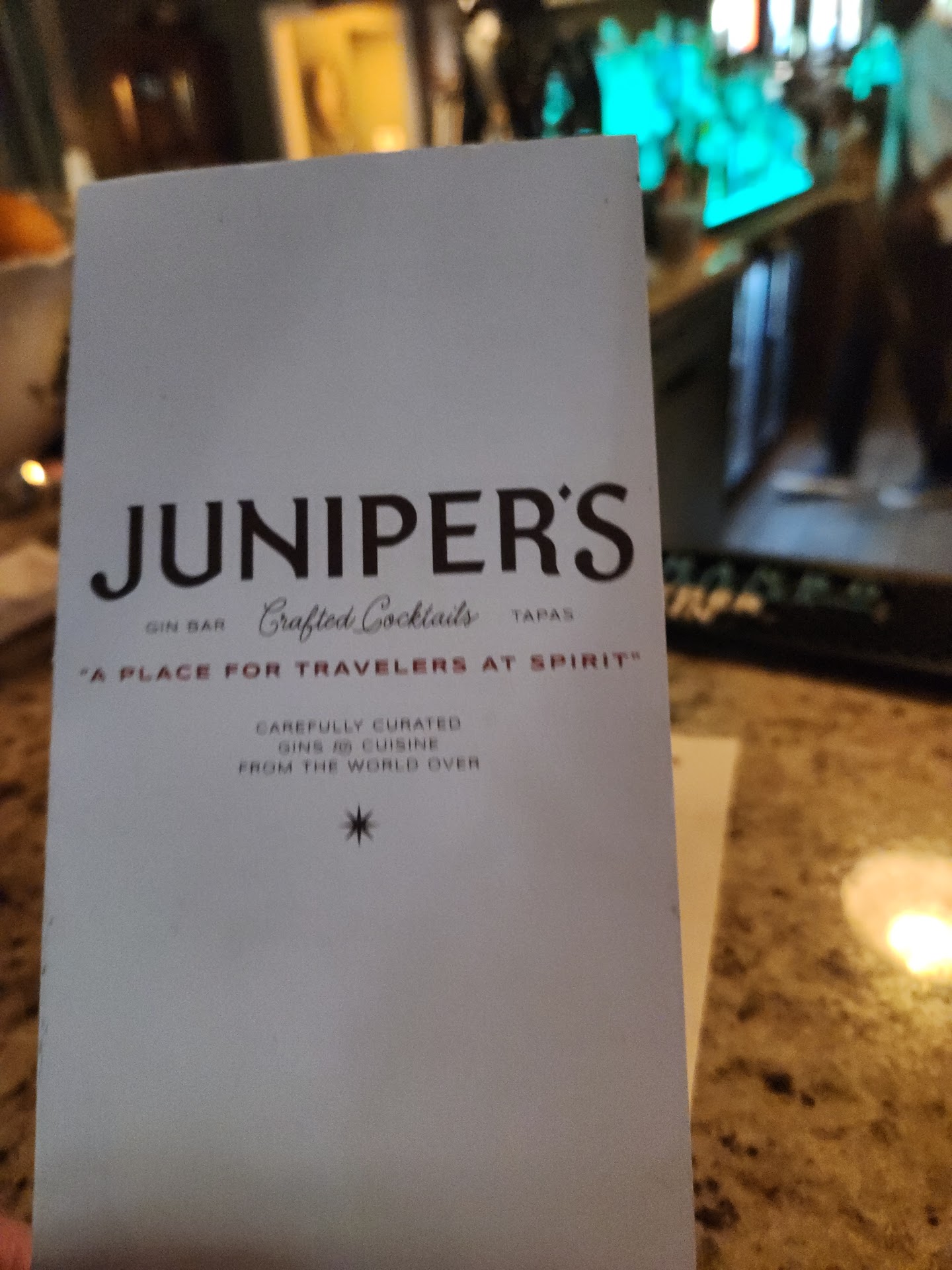 Read moreMy husband and I went to juniper's for the first time this past weekend. I am a gin lover and really wanted to try this place. It is really lovely and cozy inside and we were treated to some soothing a jazz music while enjoying our cocktails. I had the traditional French 75 which was very tasty and my husband had a flight of different gins. This establishment is very unique in that they have 244 different types of gin. We did meet the owner who was behind the bar on our visit. He was very friendly and helpfully described each of the gins that my husband had in his flight. They were rather busy so we did have to wait a minute for our cocktails to be served but they were certainly worth the wait. We did not eat any food as we had just finished our dinner but I really like the fact that they provide different tapas each week, a great way to keep people coming back. I really wish that they were...