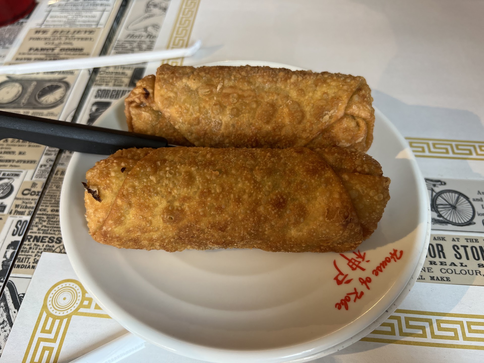 I started with my pork egg roll and found it disappointing. It was soggy, bland and inedible.
