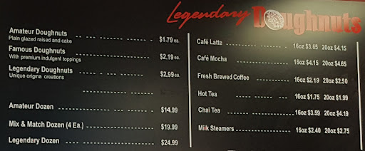 Read moreBeing new to the area I heard amazing things about legendary donuts. I handed my son-in-law my credit card and said go get a dozen donuts for Sunday morning. He came back with three giant black boxes filled with 13 super jumbo giant donuts, none like I ever knew in New York, it was almost too much. We ate donuts for 3 days... And still had some left. We are a very big boned and enthusiastic foodie family oh, so large portions are the norm, but this was definitely sugar overload. I don't have any complaints about the donuts they were very very good, with the exception of what I thought was Boston cream which turned out to be more like cheesecake, which made me hesitate for a minute oh, but it did grow on me. Legendary donuts are definitely legendary. Start small, and don't go for the whole dozen, AKA baker's dozen, unless you have at least 20 people who want donuts. They are very good, and for the portion size price accordingly.