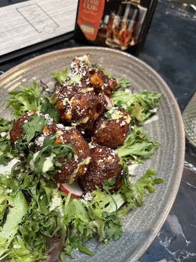 This restaurant was in the hotel lobby. There wasn't much to differentiate the tables from all the people checking in & out of the hotel. It took a little bit to figure out the seating and who was a server, but once we got settled, our server was pretty good. The street corn appetizer was better than expected and could have been a whole meal. Calamari was crunchy, fresh, and was on a bed of mixed greens with the small peruvian pearl peppers. Cajun salmon was decently spiced with a great crust. Braised short ribs were paired with Brussel spouts and broccolini.