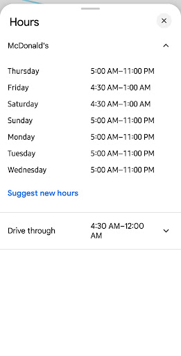 I'm currently staying in the hotel across the street and thought I would like a burger before it gets too late. So I walk across the street to the restaurant. Since I'm walking, I'm hoping for my sake that the dining room is still open. The front door is locked, but the hours for both drive thru and dine in are clearly printed on a business hours decal obviously supplied by McDonald's. It's 9:45pm but thank goodness their dine in hours show clearly that they are open until 11pm. So I walk around to the far side, and that door is indeed open. So I go in and begin placing my order on the kiosk since their business hours sign clearly show they are open for another hour and 15 minutes.. A woman, who I'm going to take a guess and say is the manager, was leaning up on the drink bar talking to another employee. Possibly taking a break, i dont know. She informed me that the dining room is closed. I replied that's not what the sign on the door says. She reaffirms that the dining area is closed. As I'm headed towards the door, she says I can go ahead and place an order since I'm there. I replied no ma'am, im going to get my truck and go around like everyone else." She said ok as I walked out. So I walk back to the hotel and get the keys to my truck. Then I drove right by McDonald's and drove up the street to get a Bacon-ator combo from Wendy's. I'm glad I did so because I was back in the hotel parking lot with my meal before 10 pm. McDonald's had only moved through 2 vehicles through the drive-through, which was full at the time. All in all, I went to another restaurant and received service with a smile, my food was prepared quickly, and it was probably a better meal. Burgers tend to taste worse when tainted with poor service, poor work ethic, and poor attitude. As I am staying here for extended stay due to a prolonged business contract, I will be looking for fast food frequently. But I guarantee I will not be looking for food under those golden arches. I added a copy of their hours from their Google site. It is Thursday August 8 and I am closing this review...