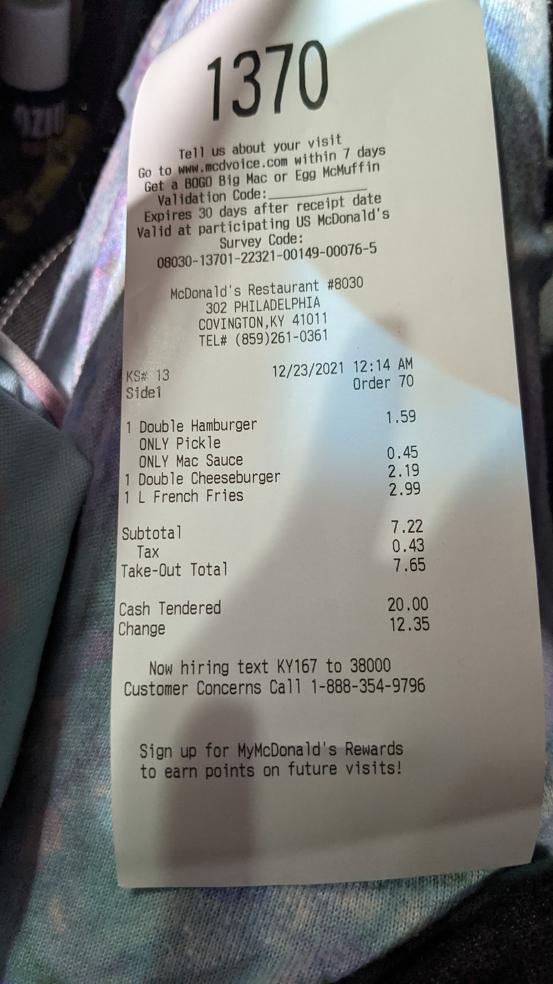 As I pulled on the interstate, I began to eat my fries. The first bite of fries I notice they were cold and hard as a rock! Now, I have received and ashamedly eaten older fries before but they were never rock hard! Since I was starving I assumed, I had received a few over cooked fries and attempted a few more bites before I began to feel sick to the point that I couldn't even try my sandwich!