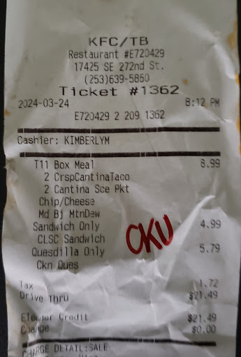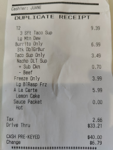 Read moreAvoid this taco hell. You'd think I'd learn from my previous mistakes of eating here but nope. EVERY time I come here there are issues and I'm literally throwing money away. Tonight's order (8:30 pm) was $17 worth of food, in which I didn't receive everything I ordered (far too common at this location), and only the double deckers were somewhat edible. The tortillas used for my bean burritos tonight looked like someone's dog had chewed on them prior. They were hard and shredded up.. The beans that 'filled' the inside were crispy. No joke they literally crunched! I won't even get into their so called grilled stuffed burrito attempt because words can't describe what this one tonight looked like. I didn't have the guts to eat it which is so disappointing. There is clearly no quality control here, or any cares given when you try and complain. I've tried calling only for no one to pick up. Filled out the 'survey' on the receipt requesting someone to contact me only again to talk to no one. Simply put the food is disgusting here and it's a damn shame. Avoid this location at all costs, you've...
