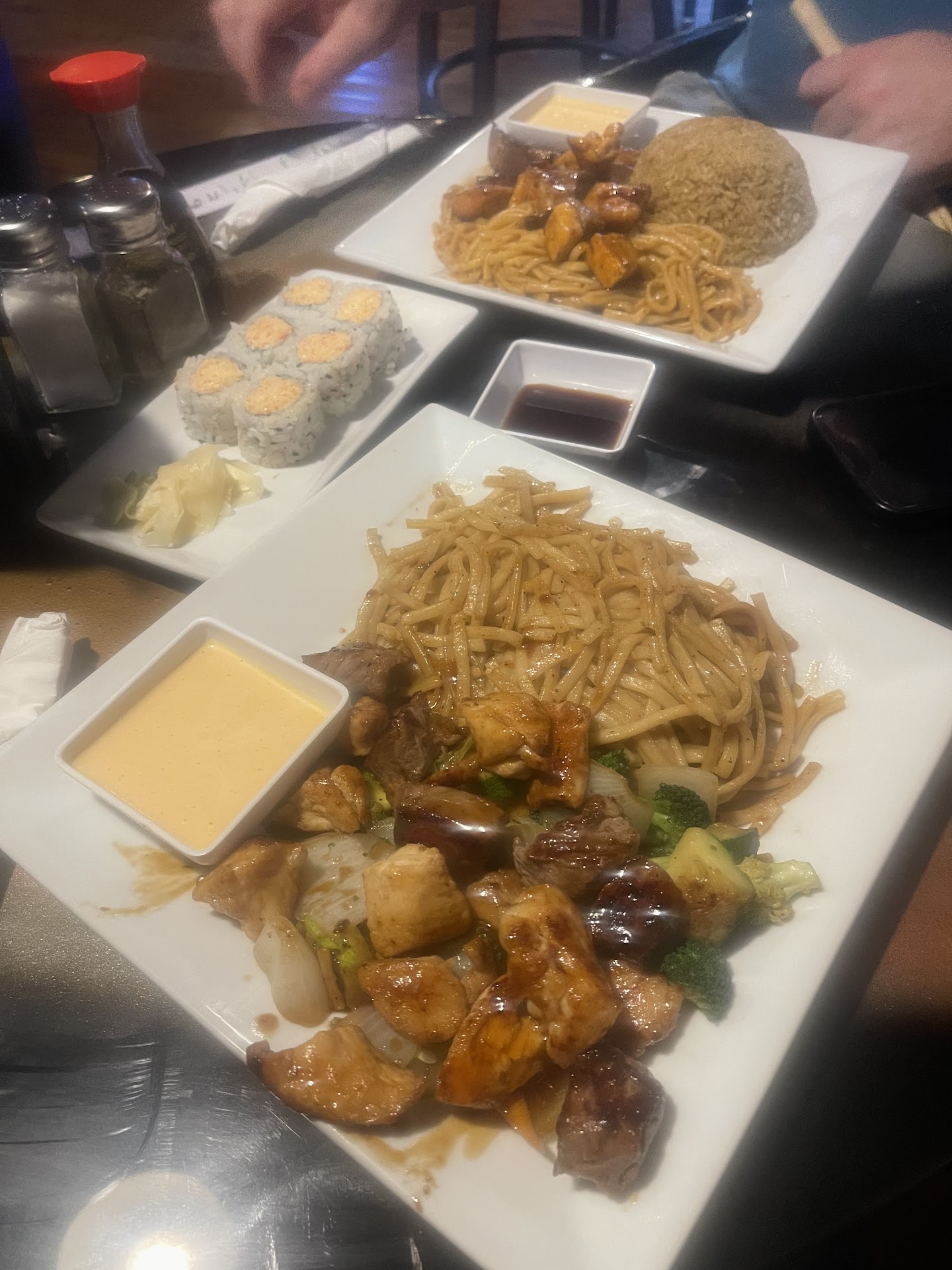 Firstly, the waitress was amazing! I definetly recommend the calamari appetizer! The sushi was delicious. You should try the taka roll, it was a 10! The shrimp hibachi with fried rice was the best hibachi we ordered. The chicken and noodles were kind of hard and dry. I was sad to see that they don't have the traditional hibachi show where they cook the food in front of you, but the prices were a lot better than those places. BTW it doesn't say on the menu, but the fried rice comes included in the menu hibachi price and they add $1.50 if you chose the noodles, but as I said the rice is better. So overall, I am super glad to have this place in our little town of covington. I will definitely be back to eat more sushi and try...