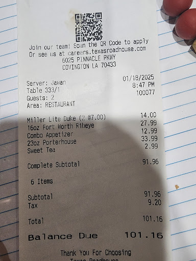 Read moreMy husband and I came here to eat with friends on a Saturday night, we knew it was going to be a wait. We finally got setted 1 hours and 10 minutes later. the waiter (Jawan) came by 10 minutes later and go the drink and appetizer order. We finally got the drinks 15 minutes later and the appetizer came out at the same time. My husband's friend asked for a refill on his drink at this time, and the waiter took the orders. 30 minutes later I was done with my drink and the waiter (Jawan), came back by and asked if I need a refill. I said yes and he needs his drink refilled too. 5 minutes later we got the drinks refilled ( I had sweet tea and my husband's friend had Dr. Pepper) so it wasn't like it a mixed drink. The food finally came and the waiter (Jawan) messed up the order. My husband's friend and his wife order a hand cut sirloin, fries and green beans, wife order a 23oz porterhouse with mashed potatoes, sweet potato just butter and cinnamon on it. My husband order a 23oz porterhouse with corn, sweet potato with just butter and cinnamon on it. I ordered a 16oz ribeye with Cesar salad, and a loaded baked potato. But l, that is not what the waiter order(Jawan) My husband's friends wife got the bone in ribeye with mashed potatoes and sweet potato with butter, cinnamon and (marshmallow). My husband got bone in ribeye with sweet potato and corn. My husband does not eat a fatty steak, he usually get a ny york but, he wanted to try porterhouse. The waiter that came out with the food was not (Jawan) so she had to go find him. He came to the table and said I guess I put the order in wrong. He did ask him it was OK or did he want us to fix it. My husband's friends wife said no she would eat it. But by that time my husband was done. So, (Jawan) said I will leave this steak and have them make you one. My husband said whatever. Jawan came back and told him he will bit the steak that was wrong in a box for him and bring it back. It never came back, Jawan had the right steak in the box. Jawan never had a manger come by. He did change my husband's friend the right price but after everything that went on you would think something else would have been done. Jawan charged us for the porterhouse, my steak, 2 beers and a sweet tea with appetizer. The bill was 101.16. We have eat there many times, but we will...