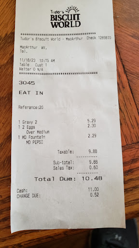 Read moreFood and service was AWFUL!!! Ordered country breakfast and country steak dinner both was served ice cold and you couldn't cut the steak with a chain saw.Returned it to waitress and she had to call the manager At HOME to see what action to take.This was at 4:30 in evening dinner time and just 1 waitress and cook working waitress was working counter AND drive through plus they were having heated words with each other.The waitress explained to us both she and cook were new as she tried to smooth things over.I have been a long time customer and never experienced this kind of service so my question is this Why was there no management on duty especially with 2 new employees??? Don't think me or my family will be visiting this Tudor's again.Put some help in to take care of your...