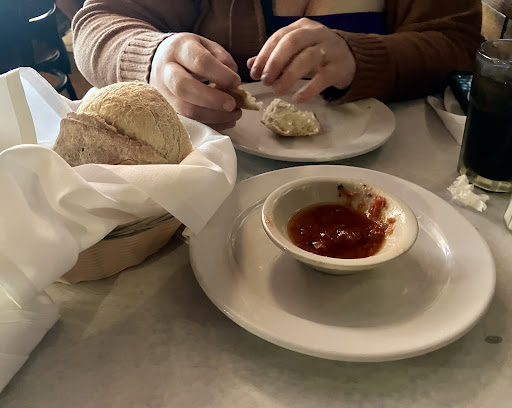 Soon after this order was placed a basked of warm bread was set at the table, alongside what I believe was sun-dried tomato (paste?) and olive oil - At this point everything is hitting the spot.