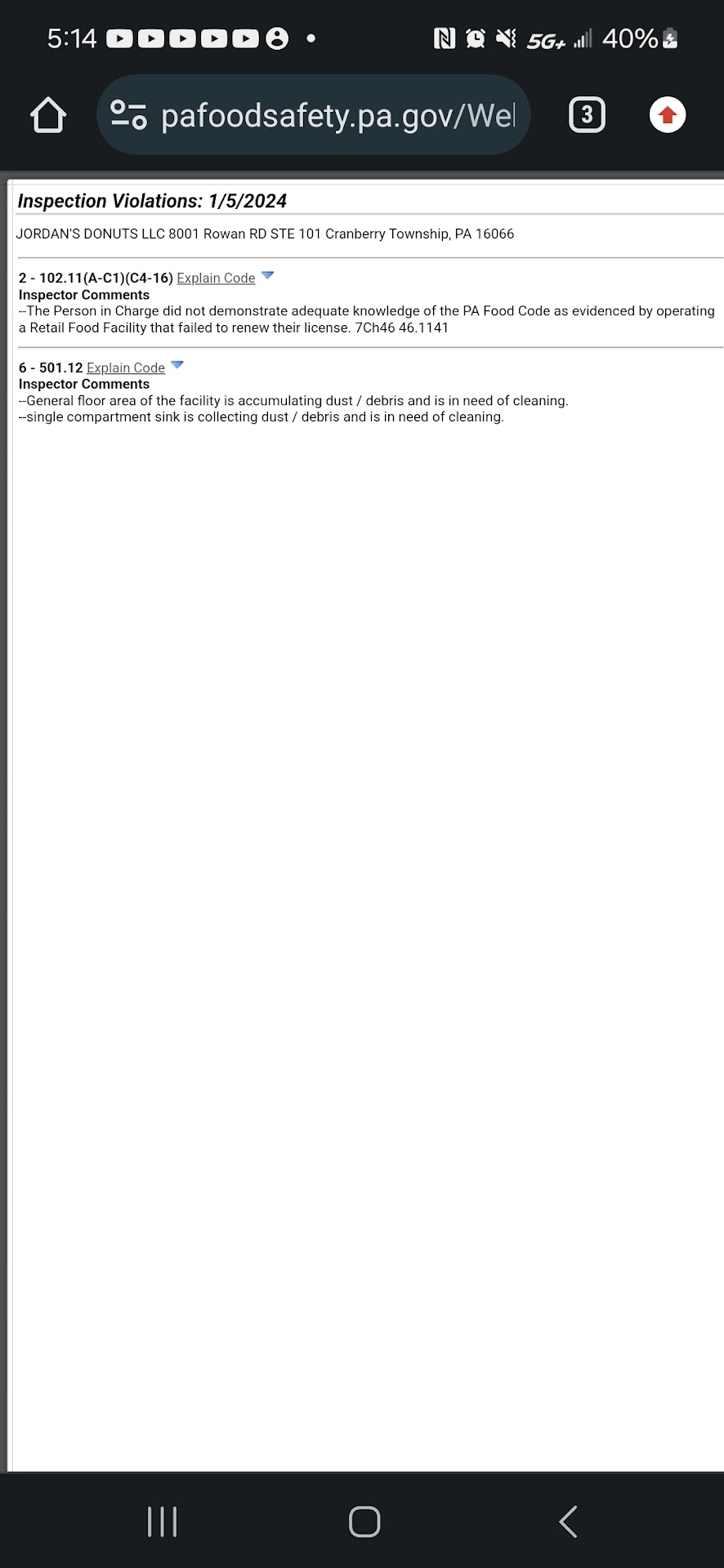Inspection Violations: 1/5/2024