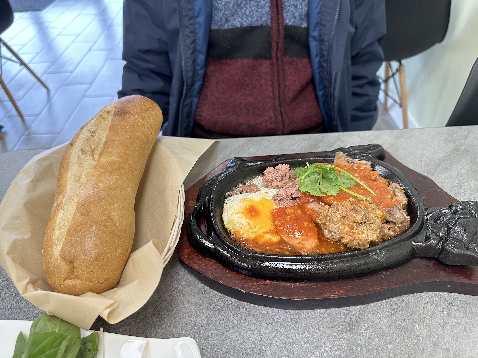 My father got a Sizzling Plate-Bo Ne, which consisted of steak, egg, and sausage with a flavorful tomato sauce. There also seemed to be some mashed liver of some sort included. On the side, he was given a Vietnamese baguette.