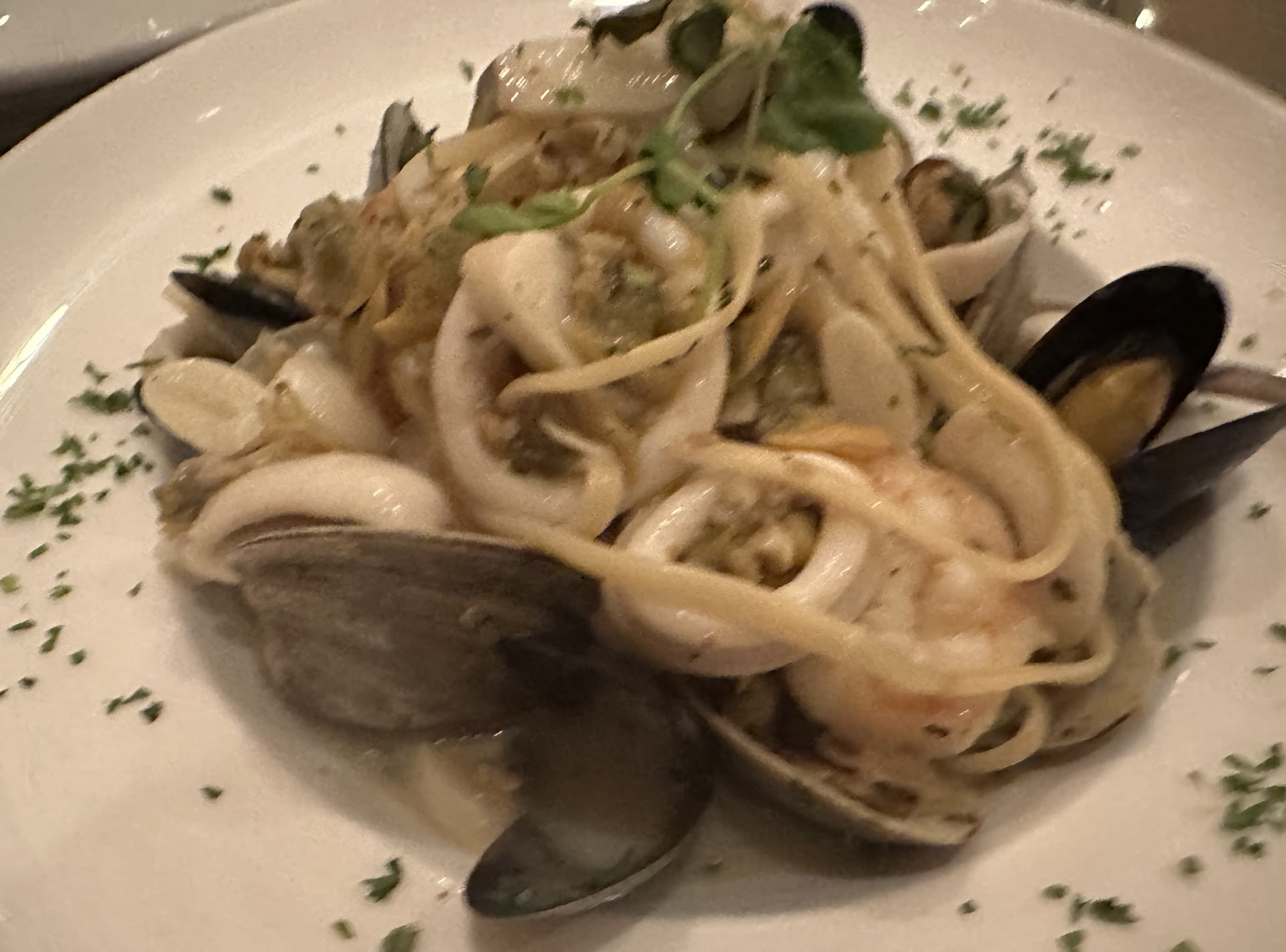 Food: Did not eat the salad that was given. Appetizer, Meatball Ricotta, I did not believe the three meatballs in sauce with some dollops of ricotta were quite worth the value for cost. Not seasoned to my taste and nothing special. Entree: attempted to get the Tortellini Alfredo and Cajun Shrimp but they were out of tortellini. Opted to try the Mama Mia Pasta. It was not seasoned to my taste either. The shrimp, noodles, and oil made it very wet and was a really strange combination.