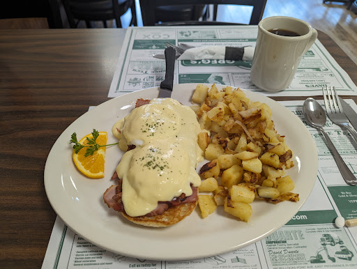 Local restaurant, usually not crowded. Huge menu, lots of variations on eggs Benedict, including asparagus (!), and omelets . Pancakes and waffles are available. The lunch menu looks interesting but I haven't tried lunch yet. Friendly service and reasonable prices.