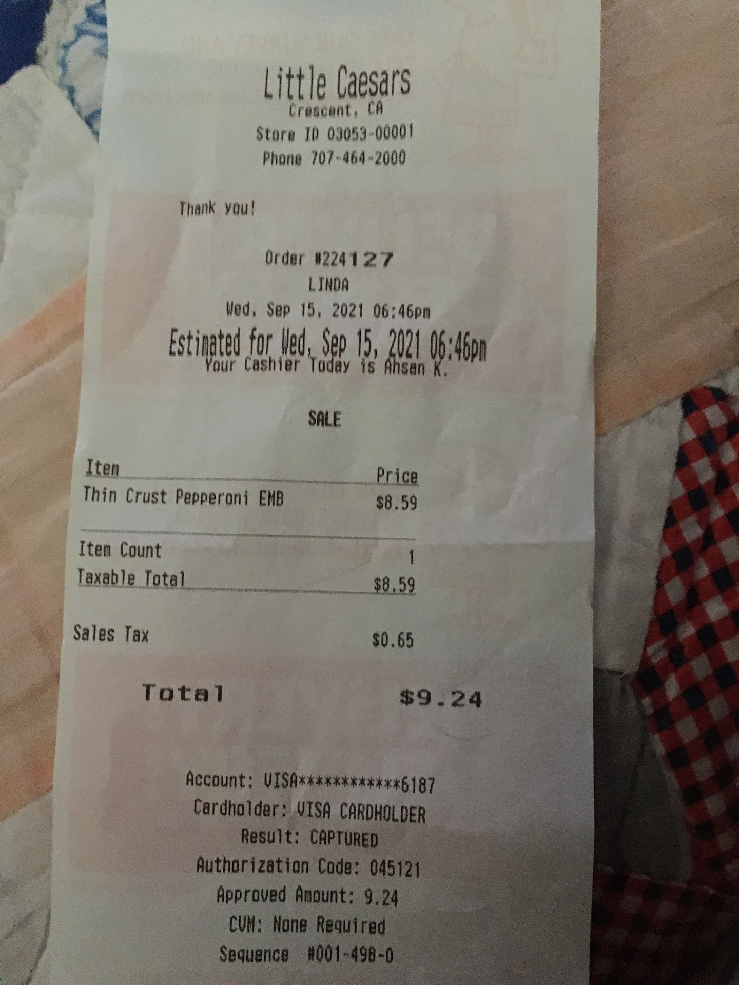 Read moreI normaly wouldn't be righting this, except for the last 5 or so days me and my girlfriend have gotten Pizza from them every night, we get home, get our Jamie's on, sit down, pray, and open the pizza....... aaaaaaand it's completely not what we orderd.... normally I'm ok with things like that but for 5 night in a row? REALLY?...... the same thing? So for this I'm leaving 1 star cause I'm not allowed to leave less than that. So I called to complain about this issue, so she took my "name" and they said that they're management would be in at 9 am tomorrow...... ya... so it looks like il be there at 9 am. I hope they have a good manager who knows what to do in this situation and wants to help fix it. For some reason I doubt it. But we'll see. I personally haven't heard anything good about that place, but to me it's just a fast 5$ meal in a pinch, and I guess you get what...