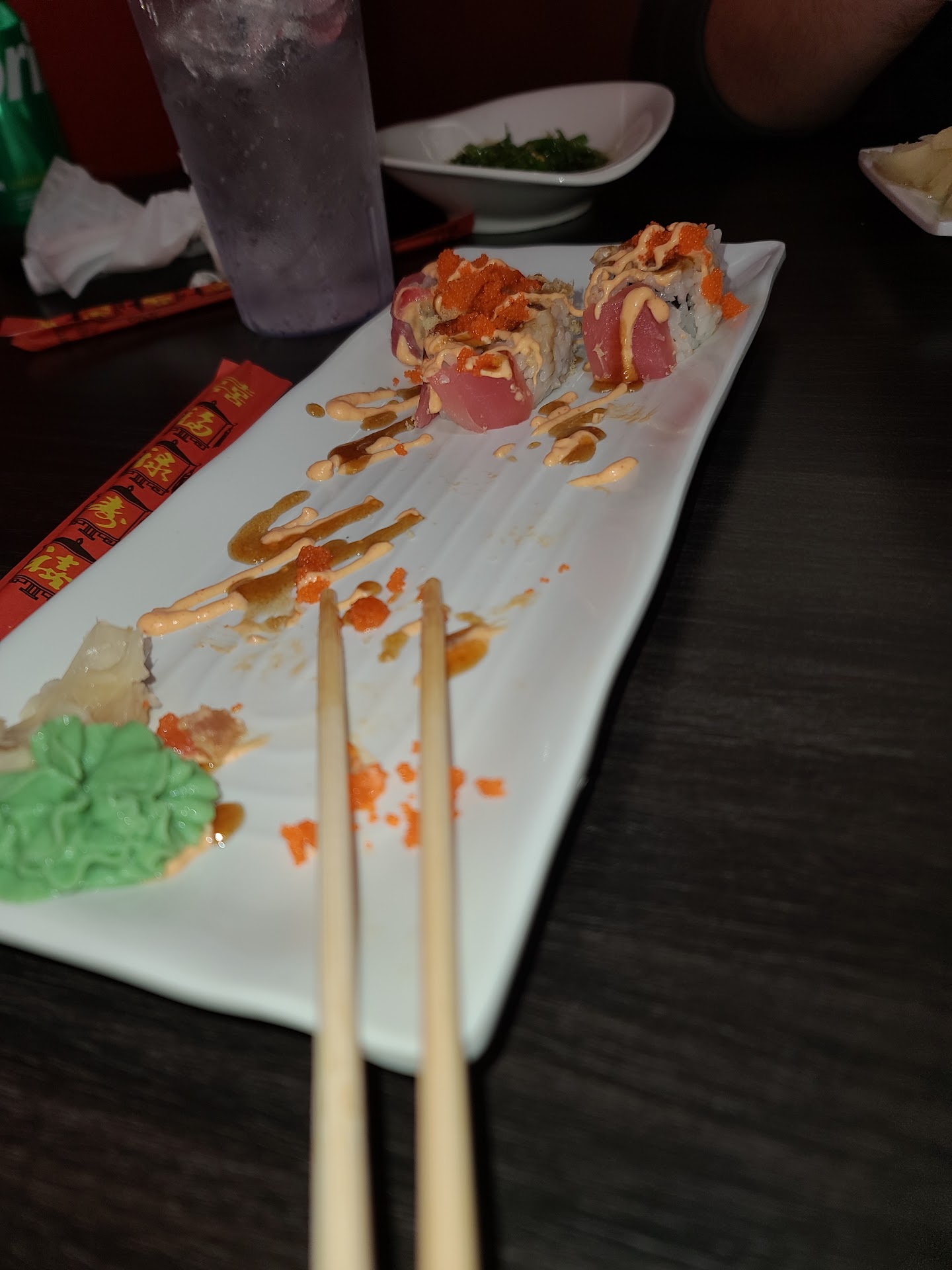 Read moreThis is legitimately some of the worst/lowest quality sushi I've eaten, I had it delivered so maybe they just thought they didn't have to put that much effort since I wasn't there in person but one of my rolls was so overfilled and sauced that it was mushy so I didn't even finish it (like I seen another review on here say) and my California roll was packed with cheap imitation crab and avocado and was practically falling apart with a few of the pieces not even being rolled by the time I got them. The eel avocado roll probably had a ratio of like 90/10 avocado compared to eel (One of the pieces actually didn't even have any eel in it which was just funny at that point) and combined with how the California roll was just makes me think they put as much filler in these rolls as they can to save on money. I was so mad at spending over 60$ and having most of it be inedible I just had to get on here and say something to save at least one poor soul from eating here. The pickled ginger was decent I guess but man I regret getting...