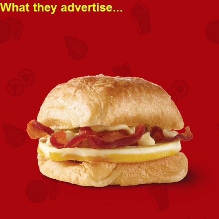 Granted, I "deconstructed" it see exactly what was on there. First, the "croissant" is nothing but a couple of pieces of bread. Second, the croissant they show is much higher (as bread should be) than what you get; the actual croissant looks like it was smashed in a George Foreman grill. Third, the egg in the ad picture is nicely shaped, with the yolk clearly visible around the entire fried egg. In actuality the yolk is small, misshapen and clearly off to one side. There's no way you are getting a bit of yolk in every bite.