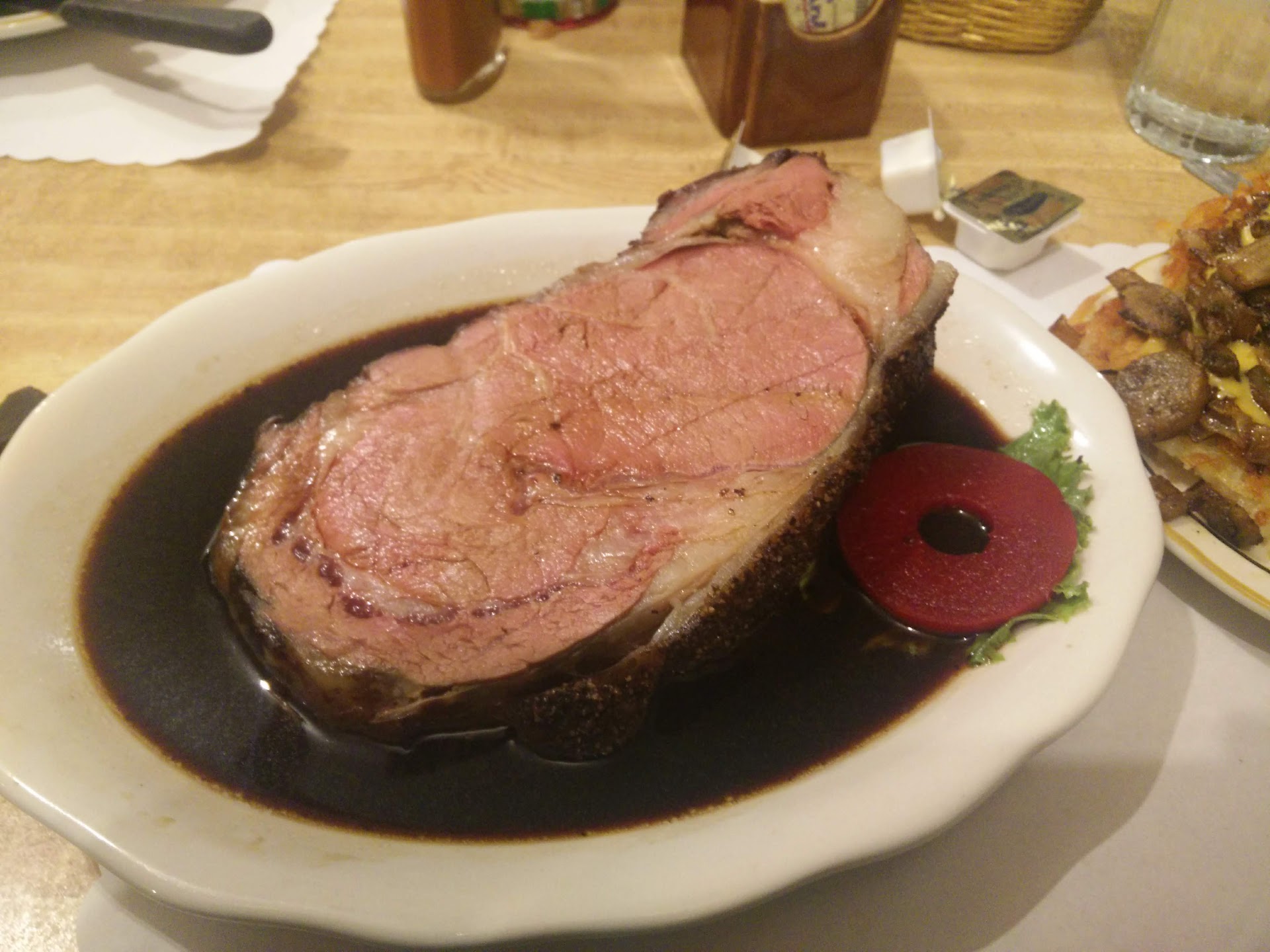 My husband ordered a prime rib. (it is $25 now for a regular cut and that's high for the area.) He ordered medium and it was very rare. It was chewy (as most rare prime rib is) and not much flavor. Once again, I had a bite and he maybe finished 1/4 of it. Just a disappointing piece of meat. It was served with a plate of hash browns set directly on top of his prime rib. Why on earth don't they use a dam tray!!