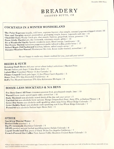 Read moreThis is a very bread-is-the-main-item kind of place, focusing on sourdough. The decor of this space is so quaint, and cozy, living up to the CB-vibe: Old West meets 2024. LOVE the inside, and the bar is beautiful! Even selling fresh loaves of bread at the front of the bar. Phenomenal food, spectacular drinks, and even though theyâd been open for only a week, the staff was really making a full effort to nail down the new cocktail list, and new menu. We witnessed firsthand the nuances of being just opened a week, but the staff was really having fun, and working hard to get it right. ZERO complaints! Emma was our point of contact and tho the restaurant was getting busier with reservations as the night went on (we arrived at 5:15 and sat at the bar), she was so warm, welcoming, attentive, conversational, and tho she said it was her first shift of the season, she pretty much crushed it! To start, the salted maple Old Fashioned was my fave and required I order two! My partner had the Chairlift Chats, which was one of the best gin drinks Iâve tried in a quite while! For apps, we both ordered a different âchunkâ of sourdough that were both so tasty, just not as sour as Iâd hoped. The honey butter was amazing, with a citrus undertone, and the Gruyère special was absolutely delicious! As our main course, we spilt the Pork Rib Chop which was, far and away, without a doing, the best pork chop Iâve ever had. It had been perfectly brined, so it was very salt forward, but the apple puree paired unbelievably well with it. And the roasted maple apples and apple slaw with sauerkraut âdustâ were fantastic! Finally, per Emmaâs recommendation, we ordered the mini cannolis and a chocolate chip cookie, both of which were super yummy! As we were leaving, Emma gave us one last parting suggestion of a âBrown Health Shotâ, which was a ginger/grapefruit juice/simple syrup and bourbon. Thereâs no way I would have EVER ordered this from a menu (plus, I didnât see it there ;), but I tried it, again at her offering⌠probably my new favorite way to mix something with bourbon! Way to make the best of the beginning of the season⌠well done @BreaderyCB! Well done!! I certainly plan to make them a regular on my rotation moving forward! Management, and the owners should definitely give the staff a huge pat on the back!...