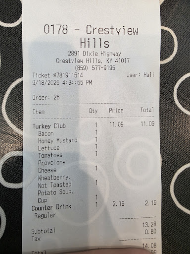 Read moreCame inside of this business to grab a meal after work tonight. I was checking the menu online and even though it displays a different price, it is priced higher at the register. I wasn't going to argue with the employee at the register but ate the extra cost. I did let them know about it, though. I grabbed a turkey club on wheatberry bread-untoasted, and a loaded potato soup.